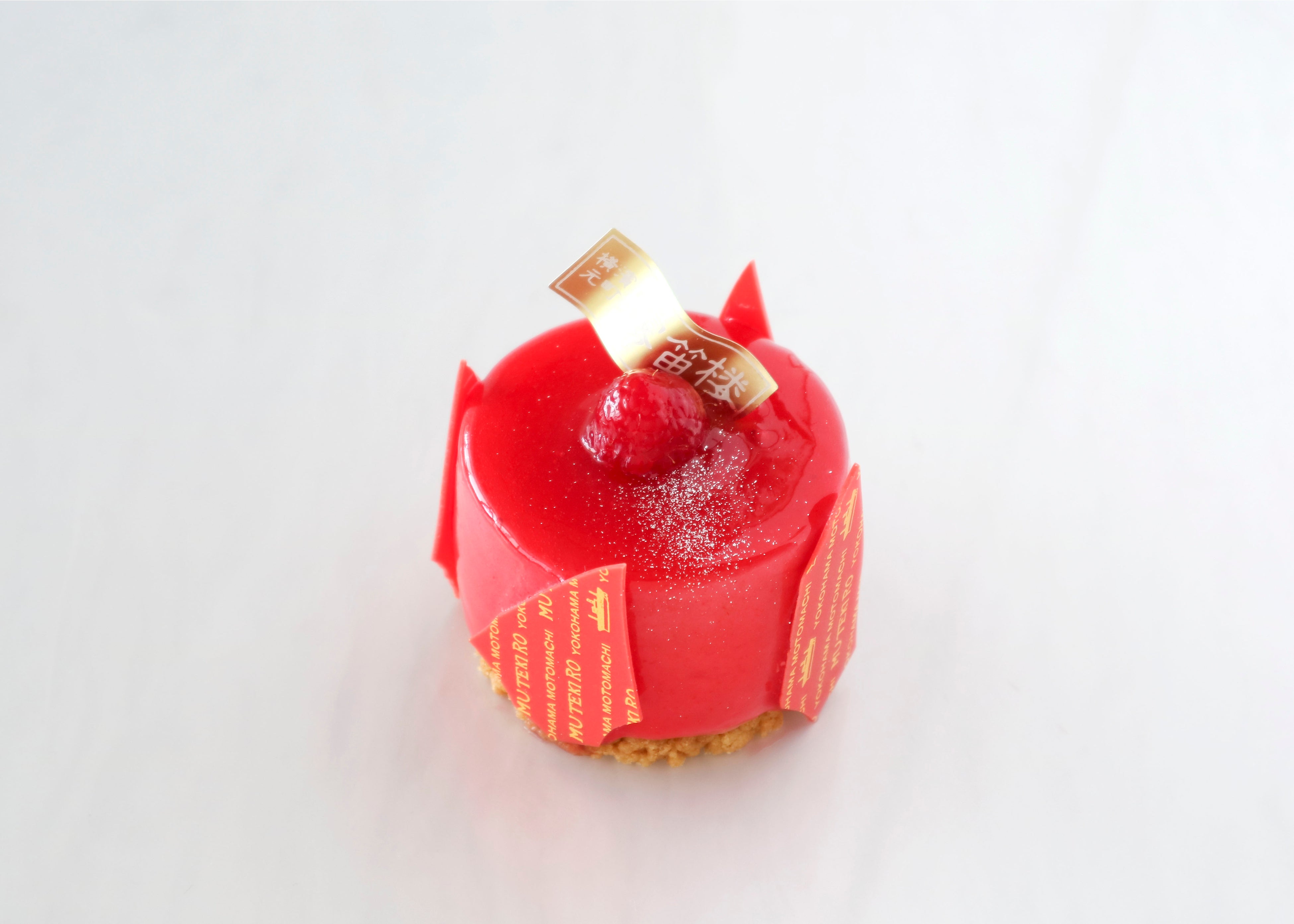 当店プチケーキ「ルージュルージュ」は、フランス語で「赤」を意味する「ルージュ」を重ねたプチケーキです。「ラズベリー」と「イチゴ」をベースにしたムースケーキで、核にある「マンゴークリーム」が酸味を際立たせてくれます。