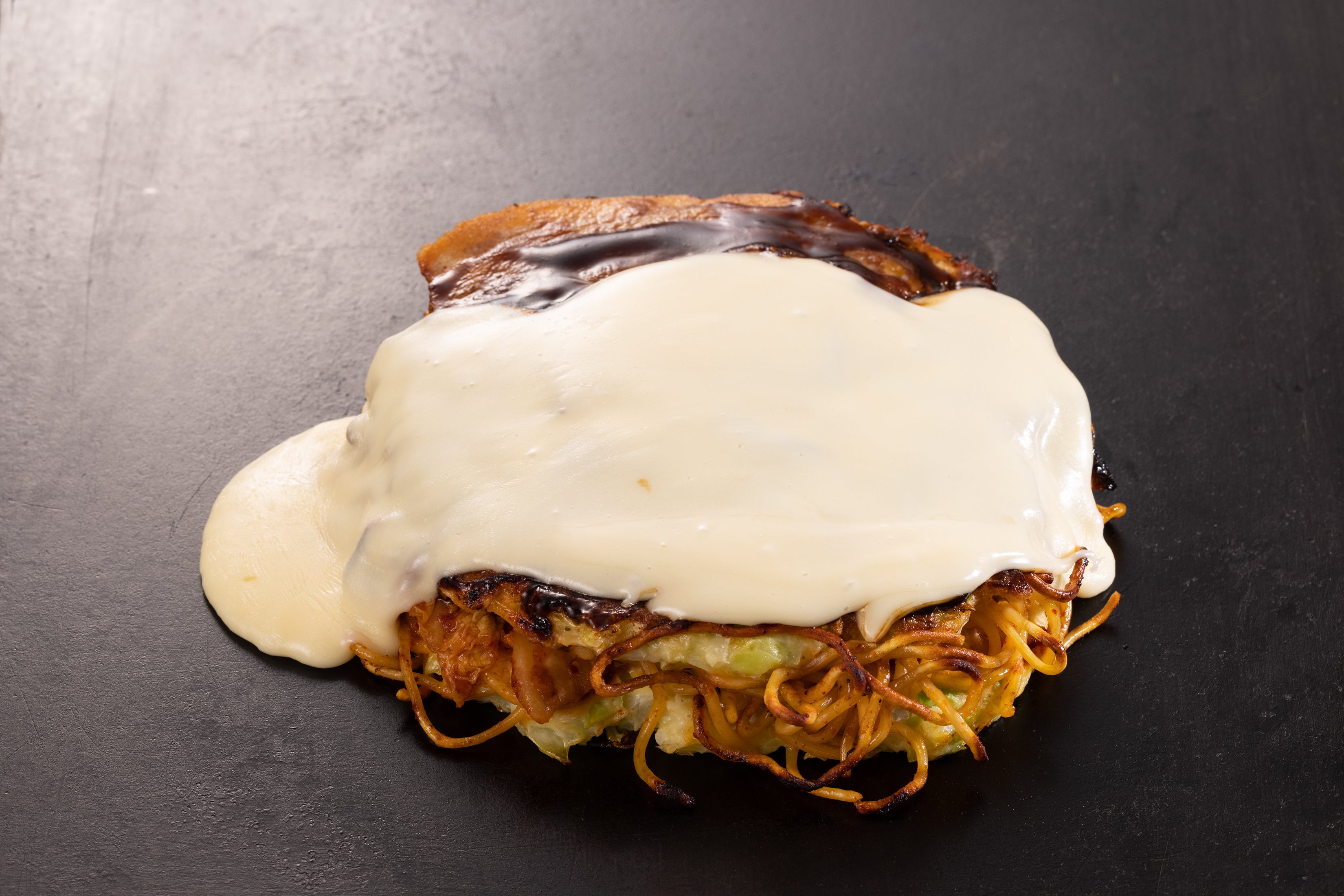 豚キムチ入りお好み焼きとチーズソースの組み合わせは間違いない美味しさ!