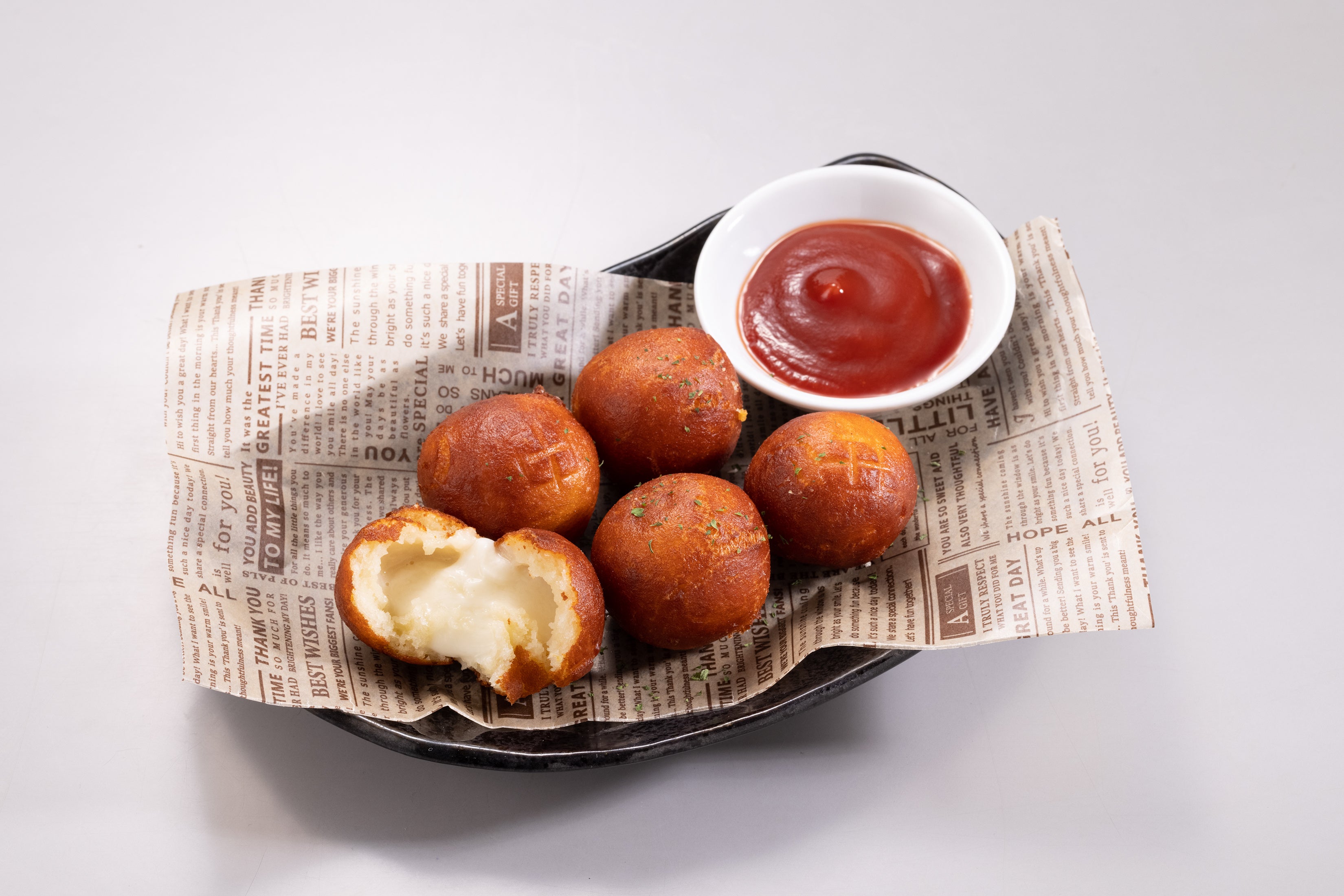 じゃがいもを練りこんだ甘めのモチモチ生地の中にモッツァレラチーズを入れてこんがり揚げました。