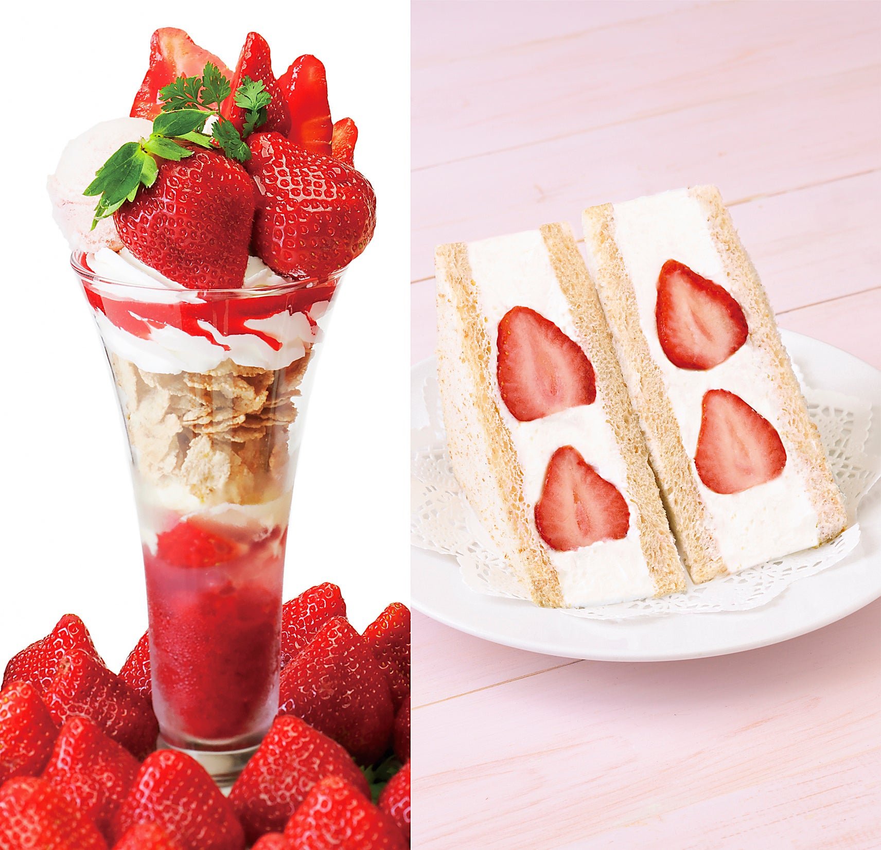 今回は、今が旬の、福岡県産苺「あまおう」を使ったパフェ&フルーツサンドが登場します。