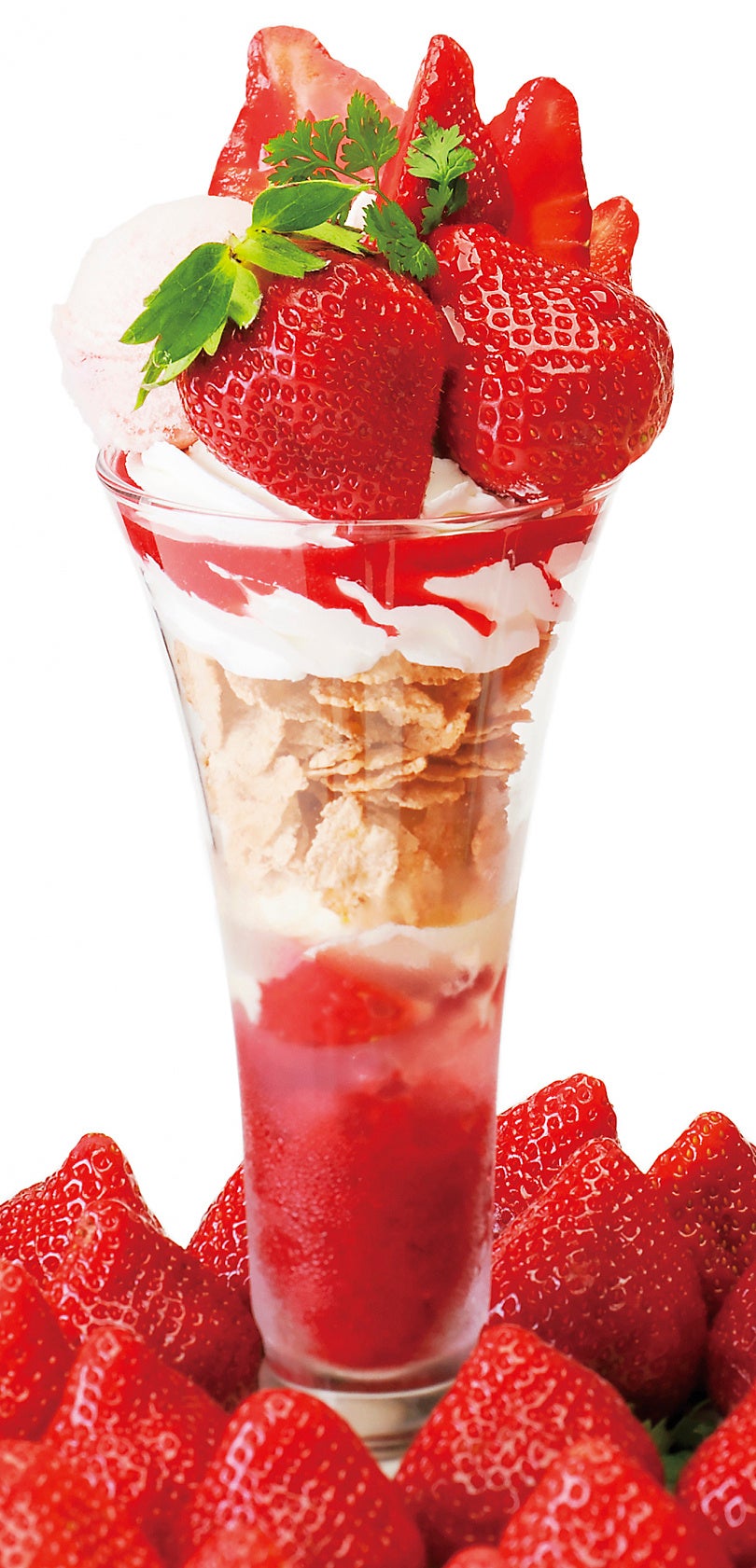 「あまおう」の中でも特に粒の大きいデラックスサイズを贅沢に4個使用しました。あまおうのみずみずしい食感&やさしい甘みに、バニラアイスとクリームのミルク感、いちごジェラートのほどよい酸味がマッチした爽やかな味わいです。