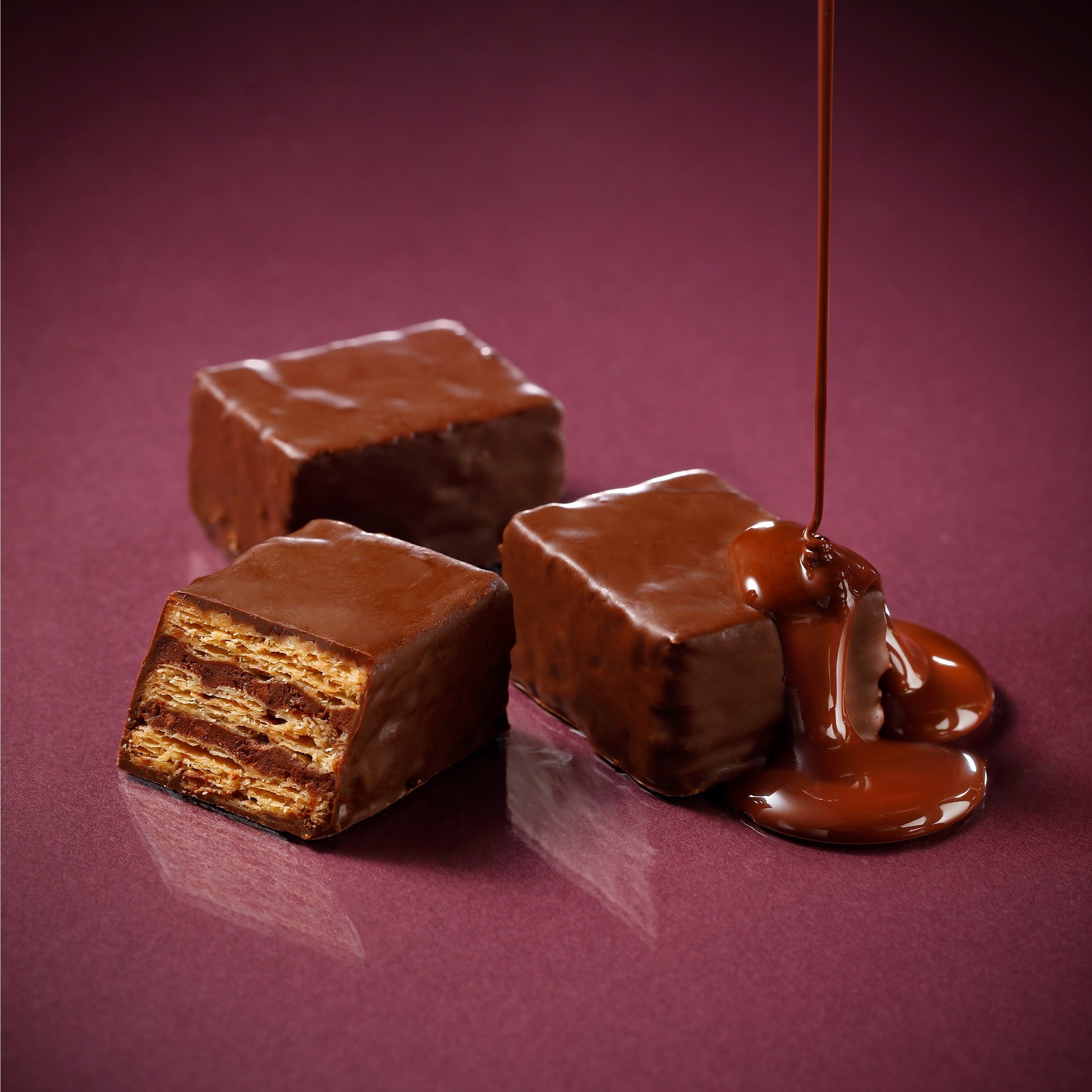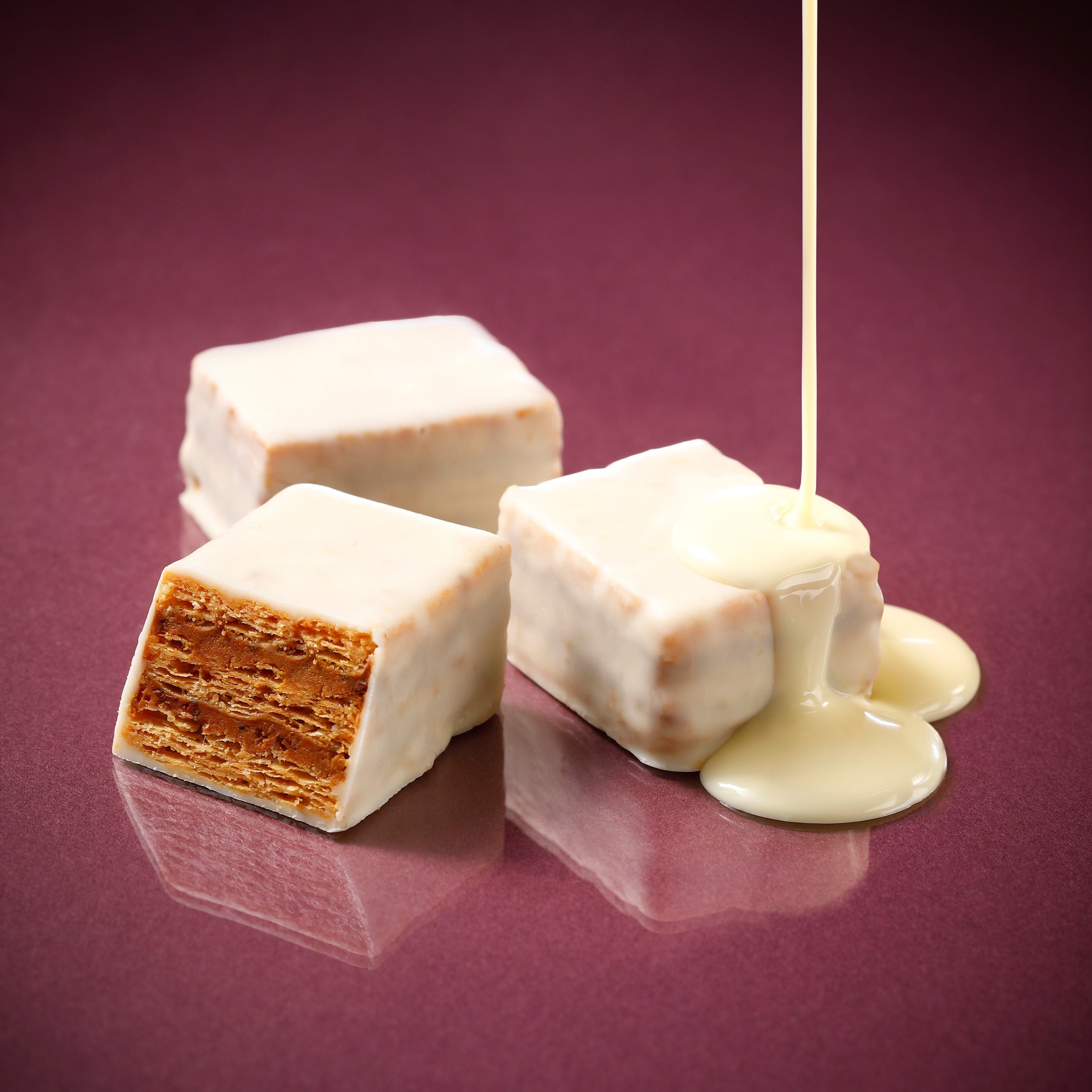 苦みを利かせたキャラメル味のクリームに高級なブランデー(カミュXO)を加え、カカオニブで食感にアクセントをつけました。サクサクのパイでサンドしホワイトチョコレートでコーティングしました。お酒とキャラメルのマリアージュをお楽しみください。