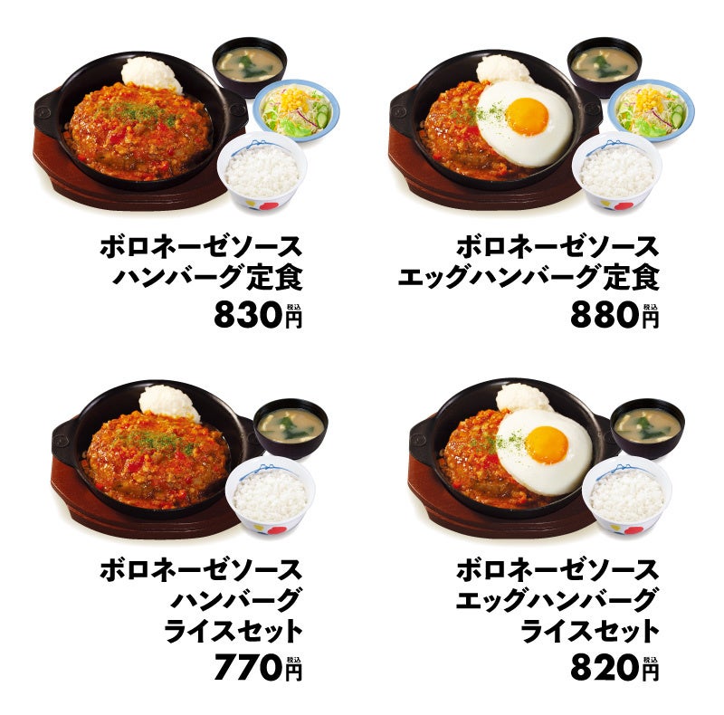 | 商品名 ボロネーゼソースハンバーグ定食 830円 ボロネーゼソースハンバーグライスセット 770円 ボロネーゼソースエッグハンバーグ定食 880円 ボロネーゼソースエッグハンバーグライスセット 820円 ※お持ち帰りいただけます。お持ち帰りにみそ汁は付きません。 お持ち帰りの場合、みそ汁は別途60円でお求めいただけます。 ※税込み価格です。 発売日 2023年1月24日(火)午前10時 ~ |