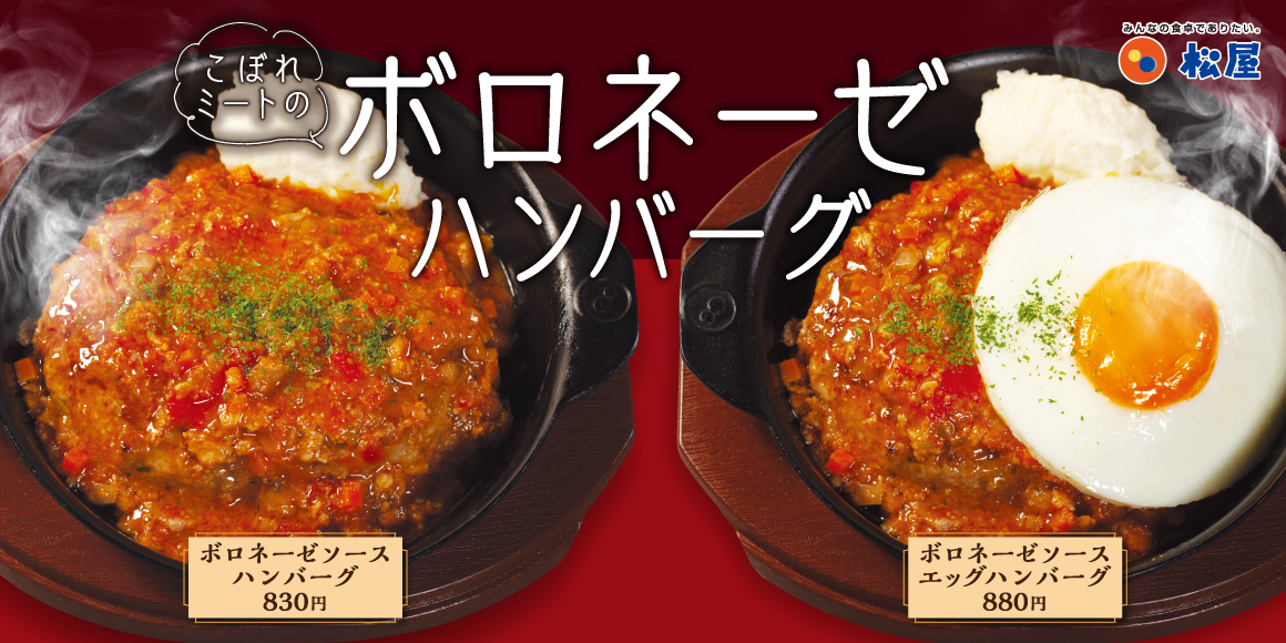 肉汁溢れる松屋の人気ハンバーグに、「ボロネーゼ」味が登場します。ひき肉とトマト、玉ねぎなどの野菜を煮込んだ松屋特製ボロネーゼソースは、「チーズボロネーゼ牛めし」登場時よりさらにごはんに合うソースにパワーアップ。旨味たっぷりジューシーなハンバーグにさらにお肉のソースがかかった贅沢なメニューに仕上げました。「ボロネーゼソースエッグハンバーグ」はさらに目玉焼きが乗った新メニューで、黄身を崩して、ハンバーグ・ソース・玉子が織りなすハーモニーもお楽しみいただけます。