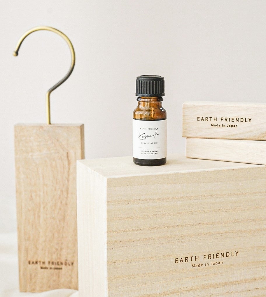 国産クスノキの廃材を使用したブロックとハンガー。クスノキに含まれる虫成分カンフルを抽出したオイルもセットに。「EARTH FRIENDLY(アースフレンドリー)」天然クスノキのナチュラル防虫セット(端材クスノキの虫よけブロック 木箱入り24個、国産クスノキの防虫ハンガー、国産クスノキオイル)5,980円
