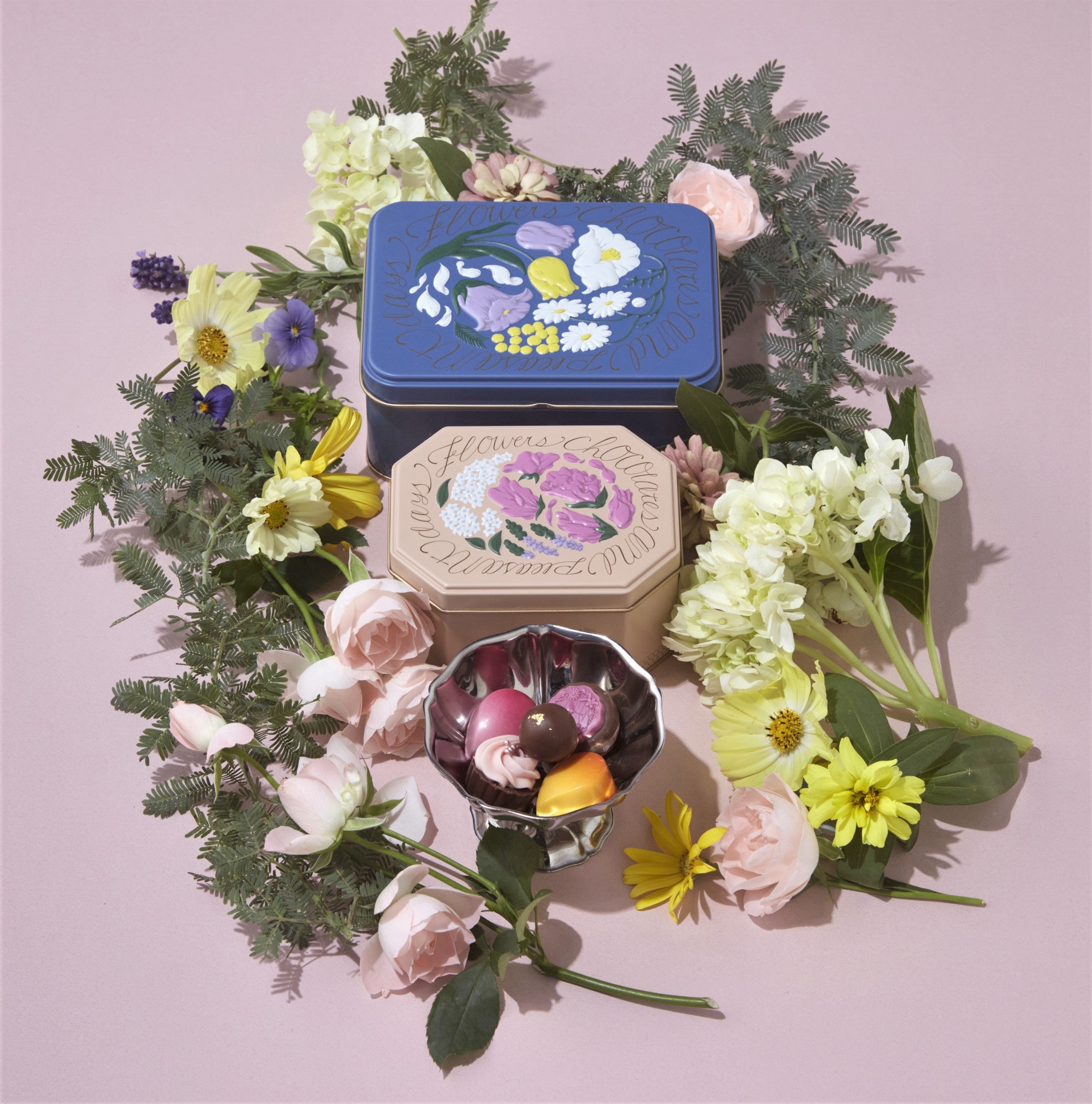 こころを満たす、“花”と“酒”と“チョコレート”がテーマ。何気ない日常のシーンに寄り添うチョコレートです。フラワーカクテルをイメージした華やかな味わいや果実のリキュールなど、ほんのり甘い気分で心地よくなる詰合せです。「花と酒とチョコレート」フラワリーカン(上・23個入り・2段詰、日本製)3,024円(下・12個入り・2段詰、日本製)1,944円
