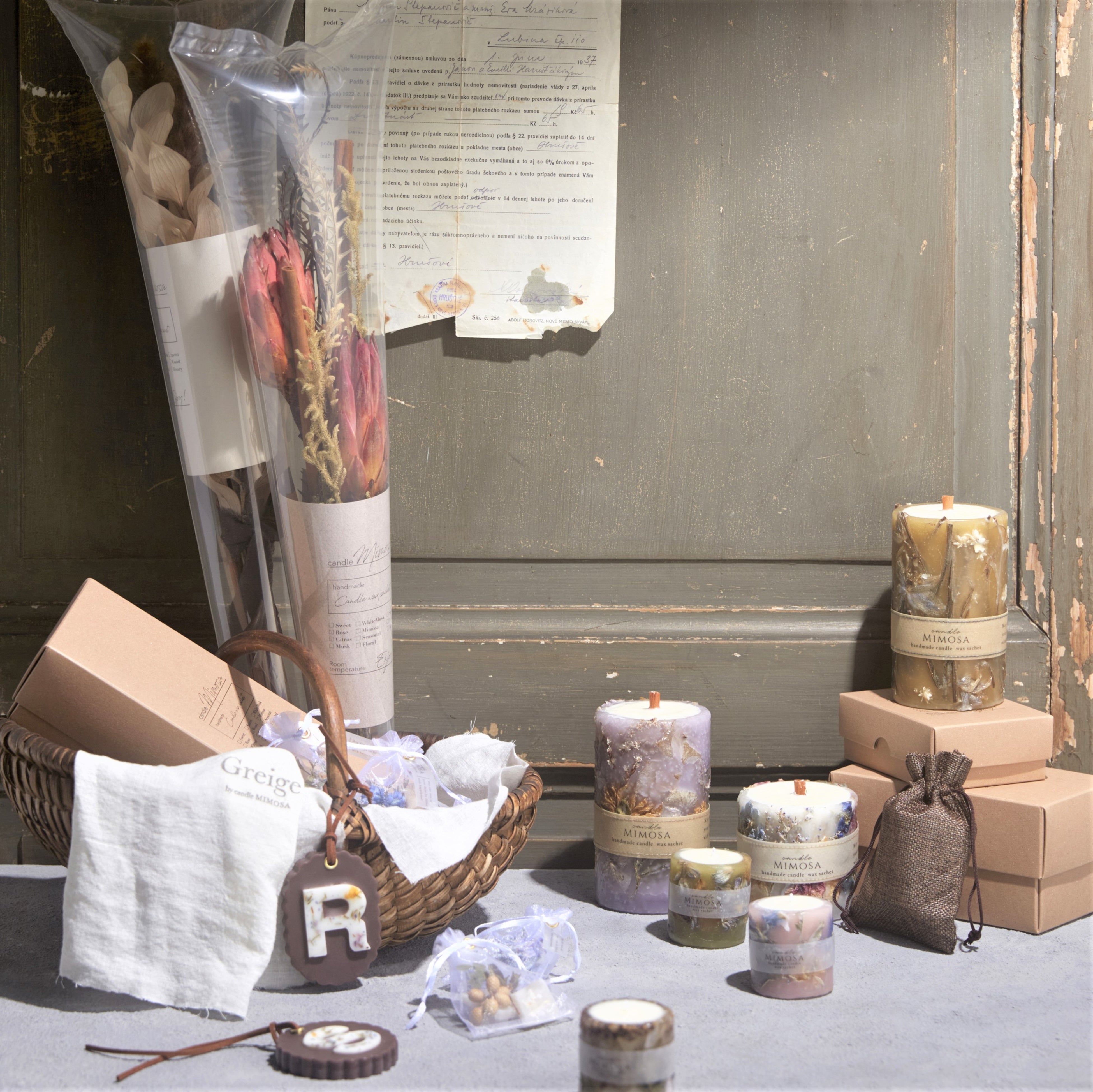 花の影が浮かびあがるキャンドル、バルーンのパッケージがかわいいブーケ、アロマをとじ込めたワックスサシェなど。花に囲まれるしあわせ時間を楽しめます。「candleMimosa(キャンドルミモザ)」ボタニカルアロマキャンドル(直径7×13cm)各6,600円、(直径7×8cm)4,950円、ミニ(直径5×5cm)各1,760円/ドライブーケ 各3,520円/アロマワックス(イニシャル)各1,320円/ミニアロマワックスサシェ(5個アソート)各2,750円