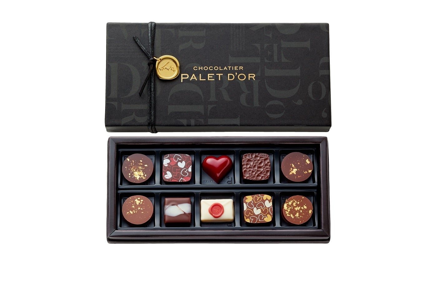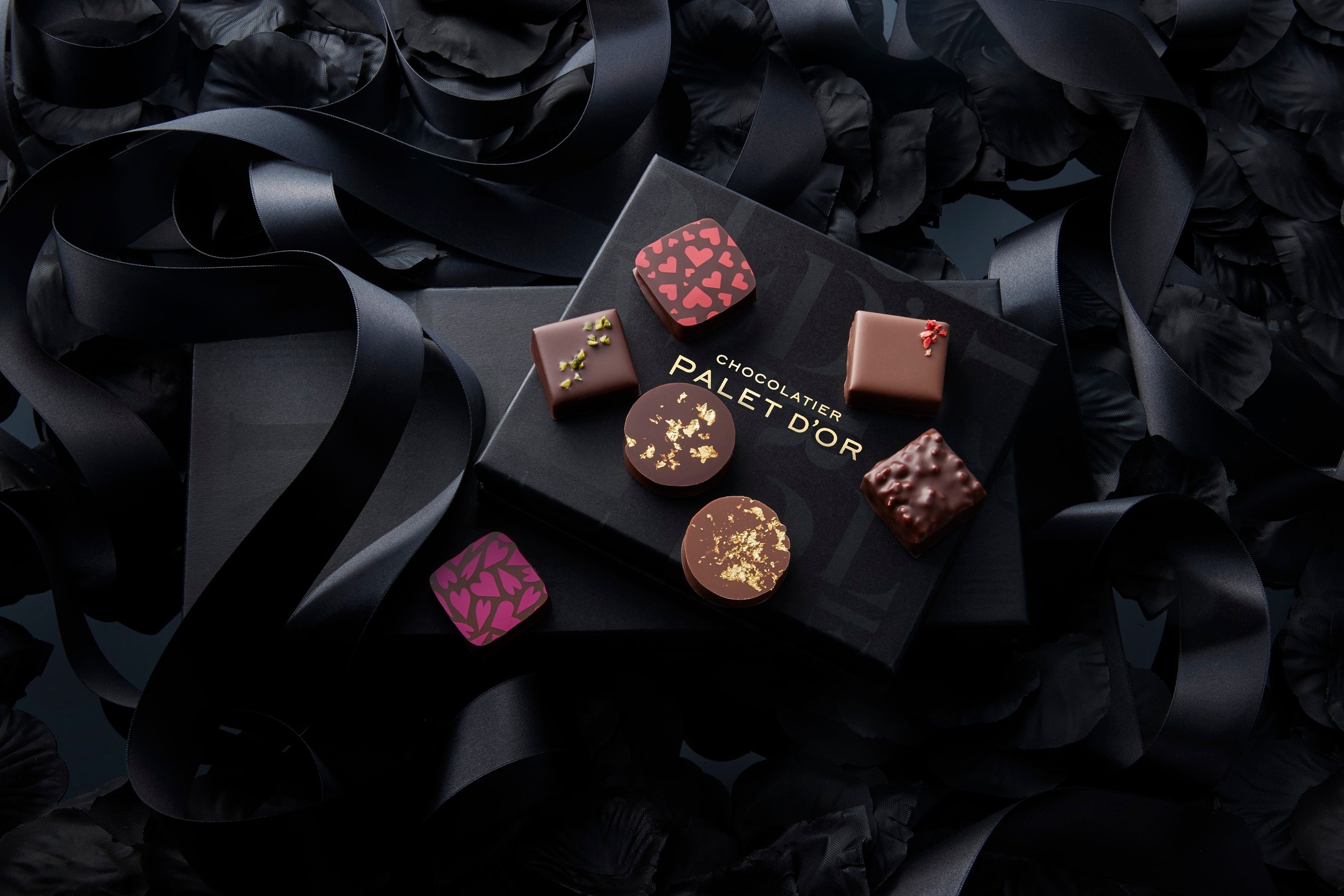 シックな黒のBOXにひときわ彩りを添えるのは、ハート柄でコーティングした2種のショコラ。ナッツの風味とザクザクした食感の「ジャンドゥジャ ノワゼット」と「ジャンドゥジャ ココナッツ」です。当店のスペシャリテであるパレドオールと一緒に人気のフレーバーを詰め合わせました。カカオ豆から手掛けるショコラティエ パレ ド オールならではのバラエティ豊かな「ショコラ アソート」は、2023年バレンタインシーズンの百貨店限定品。大切な方への贈り物におすすめの詰め合わせです。