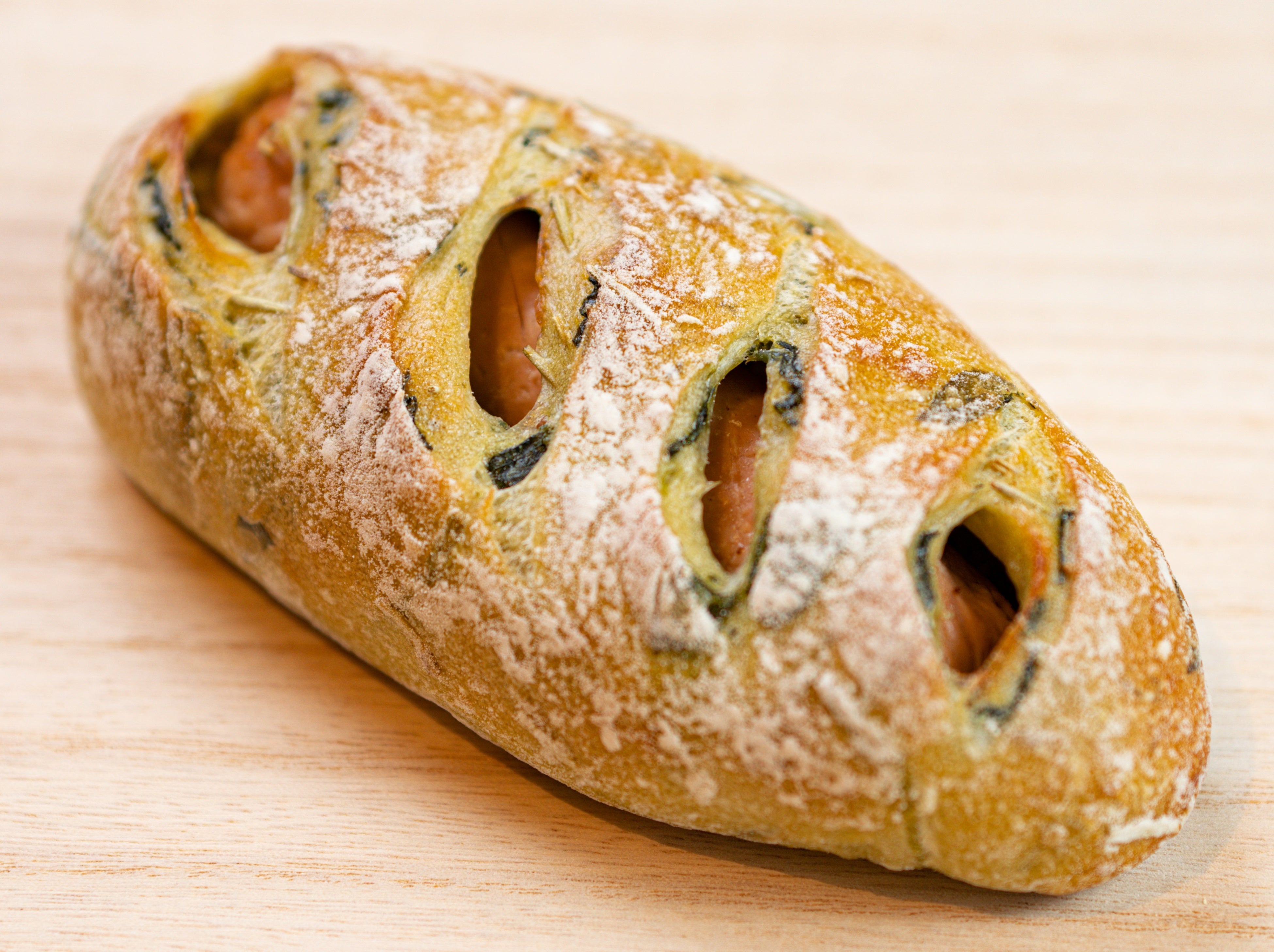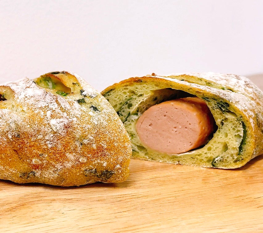大豆ミートのソーセージ・大塚食品の「業務用ゼロミート ソーセージタイプ」を米粉をブレンドした生地で包み、もっちりしっとりとした食感を楽しめるパンで包み、焼き上げたパン。爽やかなローズマリーの香り、ほうれん草がアクセント。