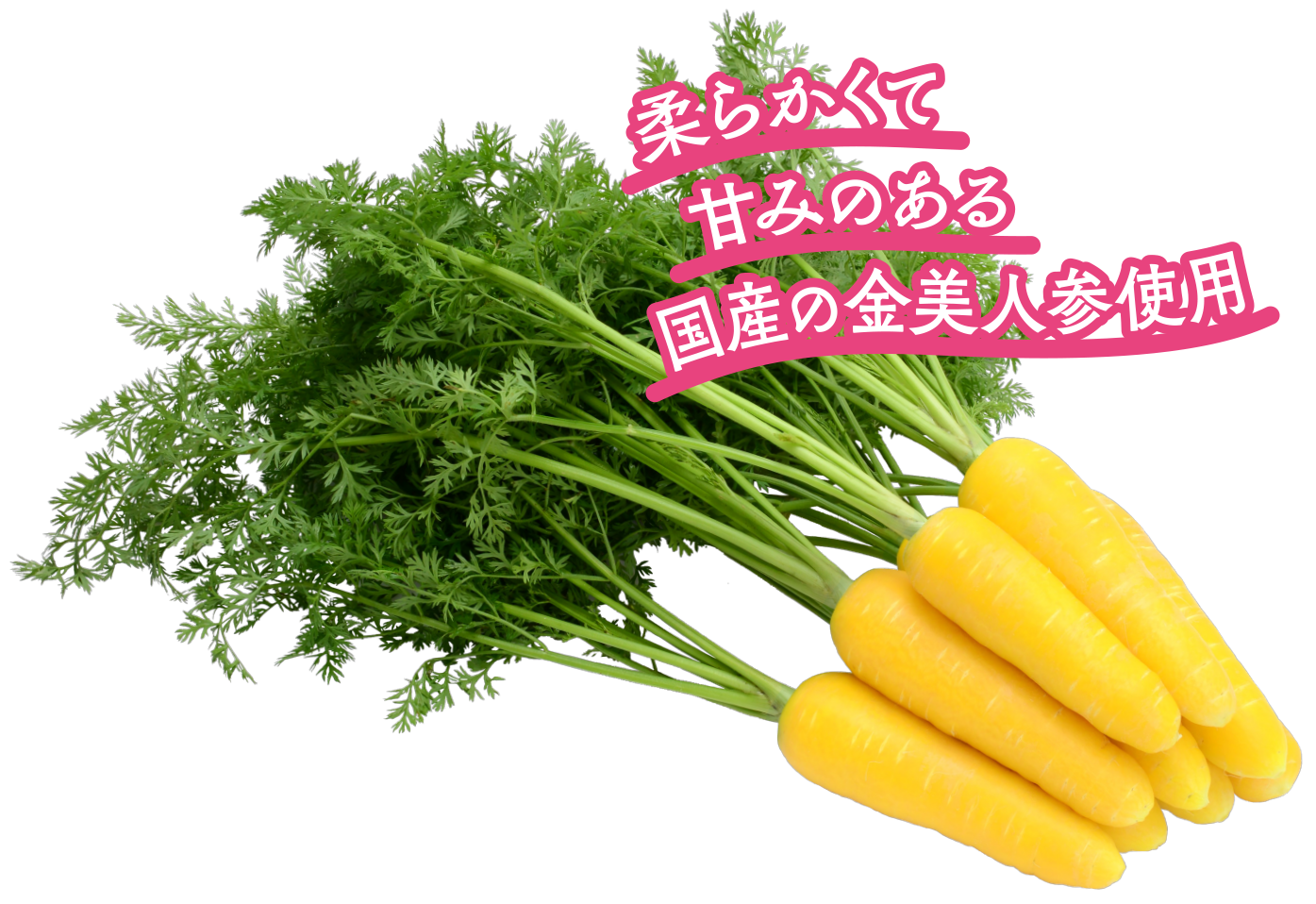金美人参は、肉質がやわらかく甘みがあり、サラダにぴったりの人参です。通常の人参と比べて匂いのクセも少ないので、野菜が苦手なお子さまにもおすすめです。鮮やかな黄色が特長で、食卓を華やかに彩ります。