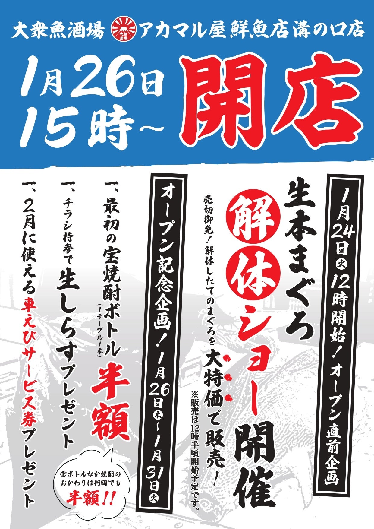 株式会社SANKO MARKETING FOODS(本社:東京都中央区、代表取締役:長澤成博、証券コード:2762、以下「当社」といいます。)は、漁港直送の鮮魚を用いたブランド『アカマル屋鮮魚店』を神奈川県川崎市の溝の口で2023年1月26日(木)にグランドオープンしたします。また、2023年1月24日(火)にオープンイベントとして生本まぐろの解体ショーと即売会を実施いたします。