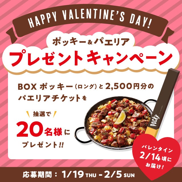 冬の一大イベント「バレンタインデー」。ビバパエリアでは、バレンタインデーに豪華賞品が届く『バレンタインキャンペーン』として、江崎グリコの「BOXポッキー(ロング)」とビバパエリアの「パエリアチケット(2,500円分)」が当たるプレゼントキャンペーンを実施いたします。
