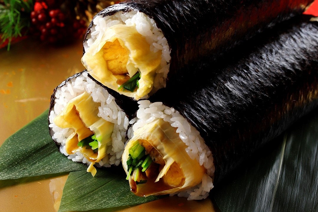 穴子、とびこ、かんぴょう、玉子、きゅうりを巻いた恵方巻です。