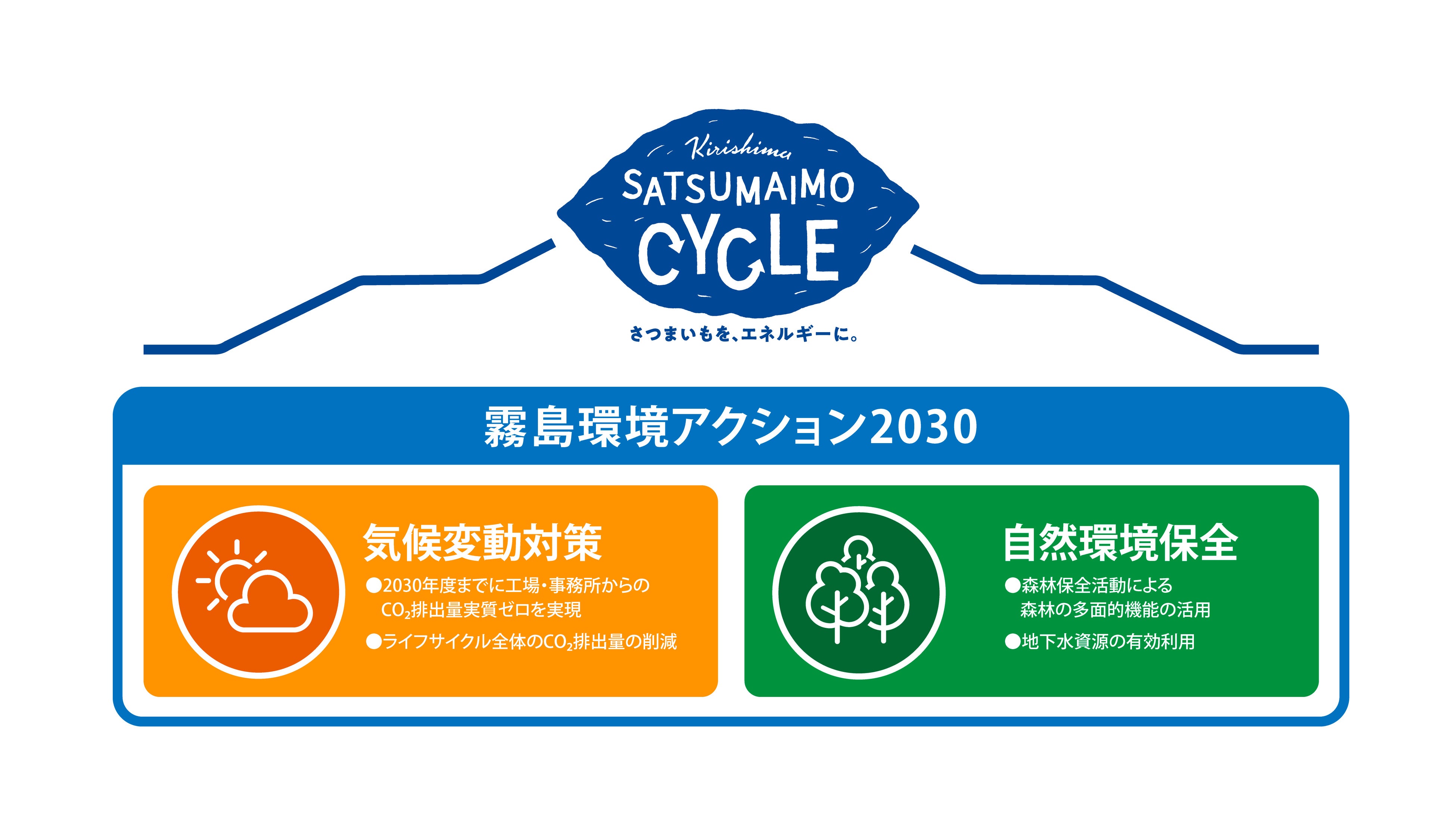 そしてこのたび、『KIRISHIMA SATSUMAIMO CYCLE』で描くビジョンの実現に向け、2030年度までのアクションプラン『霧島環境アクション2030』を策定いたしました。2030年度までの工場・事務所のCO2排出量実質ゼロの実現に向けた施策を中心に、今後予定している具体施策を「気候変動対策」・「自然環境保全」の2つの軸でまとめたものです。工場・事務所だけでなく、ライフサイクル全体でCO2削減を目指す施策を「気候変動対策」として、森林や地下水資源のさらなる有効利用を目指す施策を「自然環境保全」として整理しています。