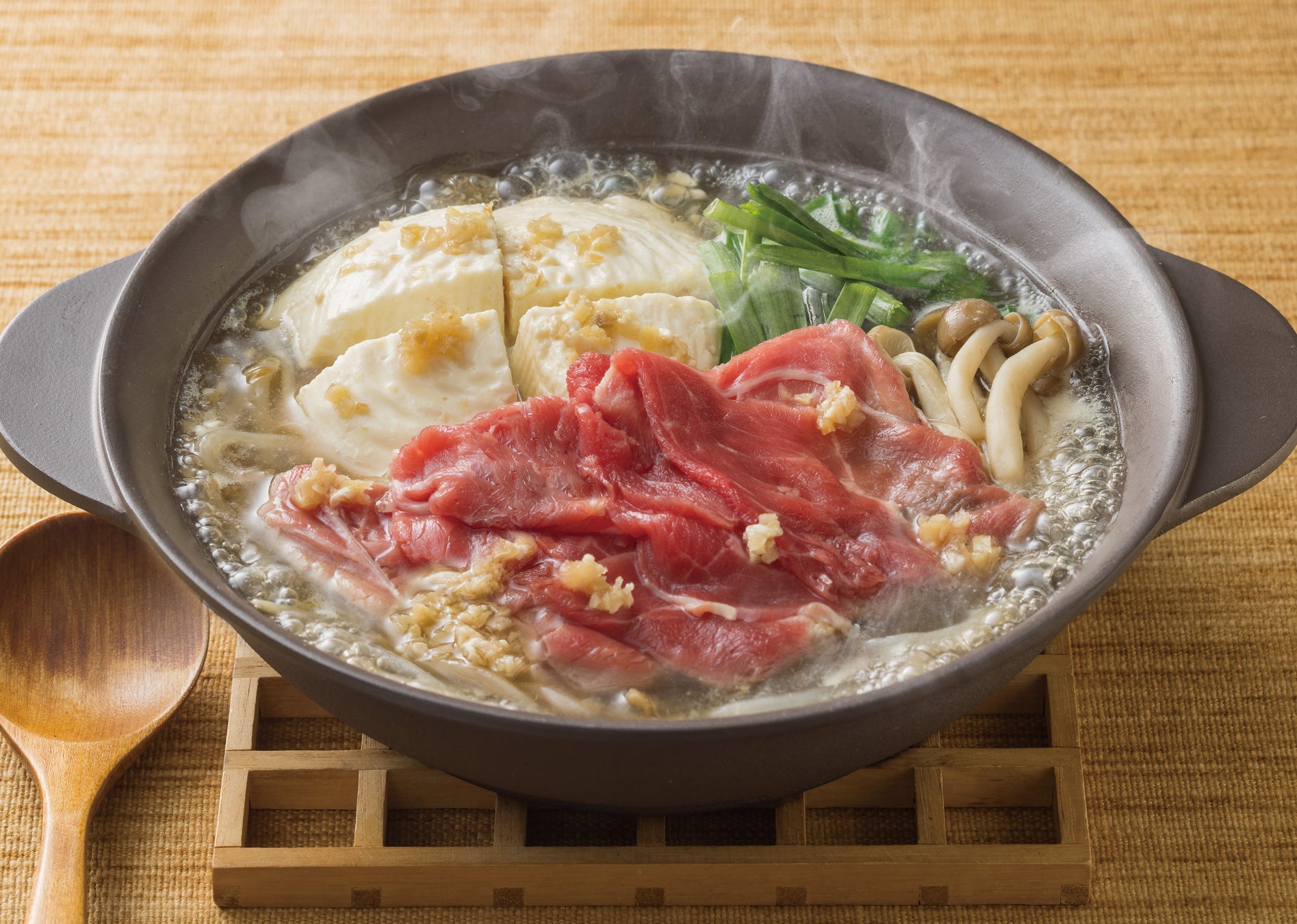 こだわりのスープは鰹・宗田の節でとった出汁に国産刻み生姜をたっぷり加えて仕立てました。牛肉には希少な赤身の部位「ミスジ肉」を使用したほか、自家製(※)豆腐一丁、もやし、ニラ、しめじを加え、ヘルシーさと満足感を両立した個鍋です。別添えのレモンを絞ることでさわやかな香りと酸味が広がり、味変を楽しめます。