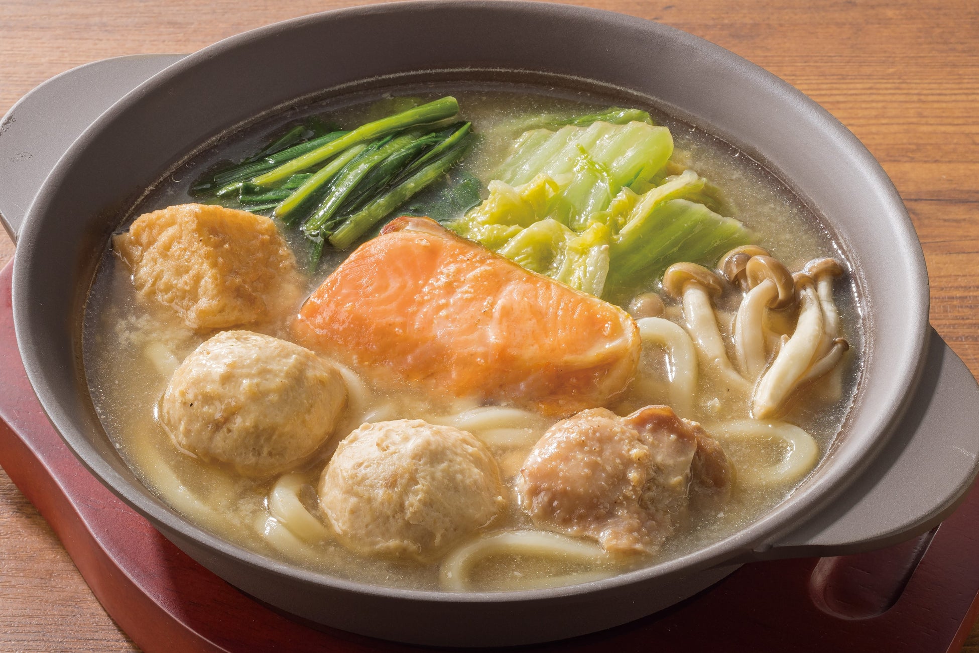 鰹と宗田の節、鶏、豚のだしに味噌と醤油等を加え、隠し味の柚子胡椒でまとめあげたスープは「ちゃんこ霧島」の板長にも認められた自信作。具材には同店監修の肉比率が高い国産鶏つくね、厚揚げ、鶏肉、鮭、白菜、ニラ、しめじに、半玉うどんを使用しており、ボリュームも栄養も満点に仕上げました。別添えのすりごまをたっぷりかける味変もおすすめです。