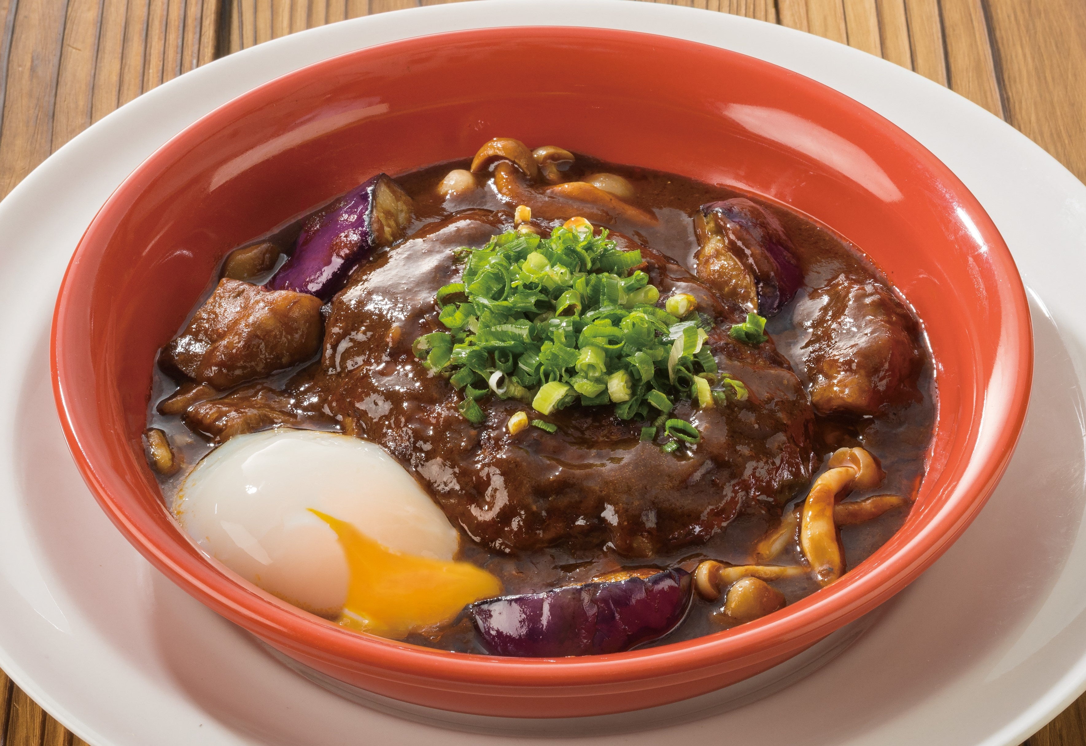 オリジナルの牛豚黄金比が味の決め手。ふっくらジューシーに焼き上げるこだわりのハンバーグステーキに、赤ワイン・デミグラス等をベースにしたソースで牛肉を柔らかく煮込んだ自慢のビーフシチューに赤味噌やしめじを加えて仕上げた特製ソースをたっぷりとかけ、煮込み風に。お好みで温泉卵を崩しながらお召し上がりください。