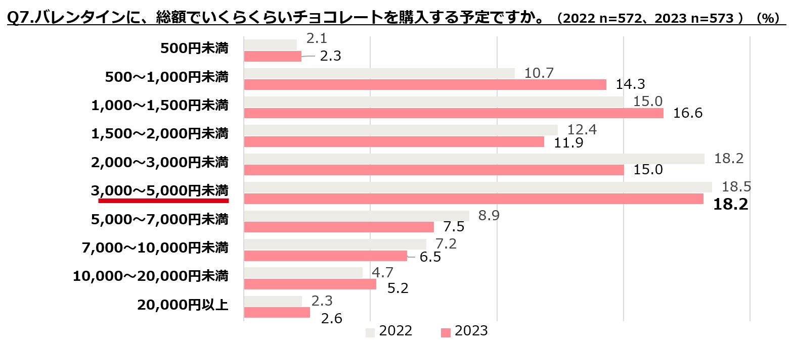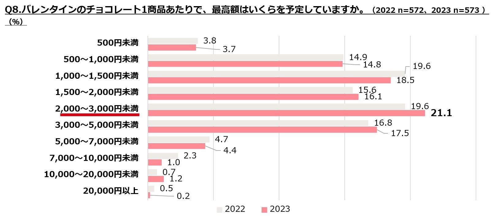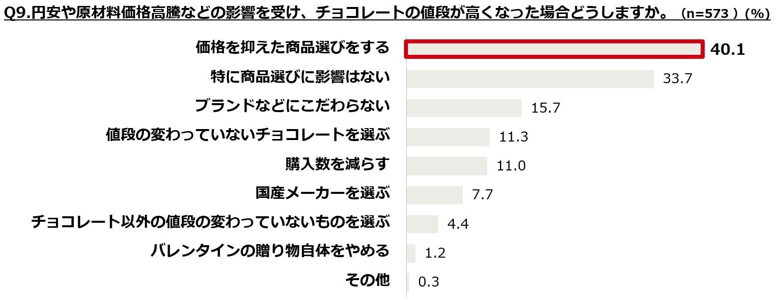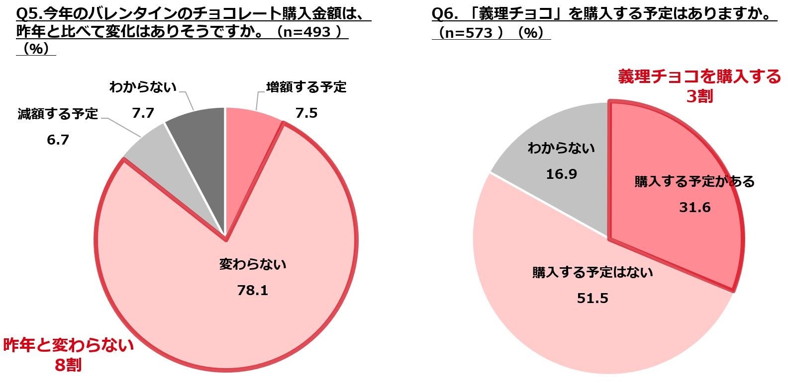 重視点では昨年はランク外だった「低価格」という条件が、今年は4位にランクイン。また物価高騰の影響でチョコレートの価格が高くなった場合には4割が「価格を抑えた商品選びをする」と答えましたが、購入金額の昨年との変化を尋ねると「変わらない」が約8割。