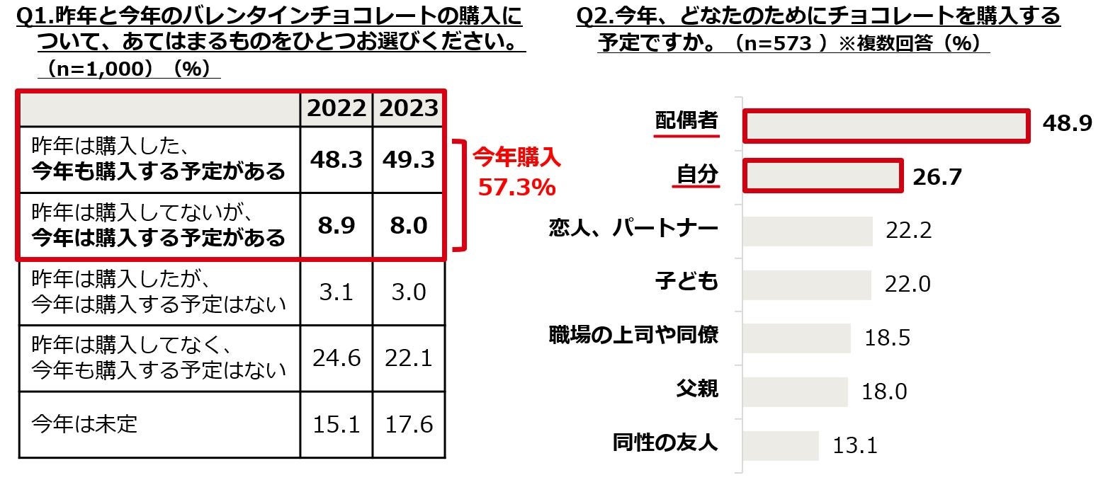 今年のバレンタインデーにチョコを購入すると回答した人は昨年同様に全体の6割。贈る相手について、昨年の調査では「配偶者」に次いで「恋人、パートナー」「職場の上司や同僚」が多かったのですが、今年は「自分用」が「配偶者」に次いで2位に。自分向けにご褒美チョコを購入することは、もはや一般化しているのかもしれません。