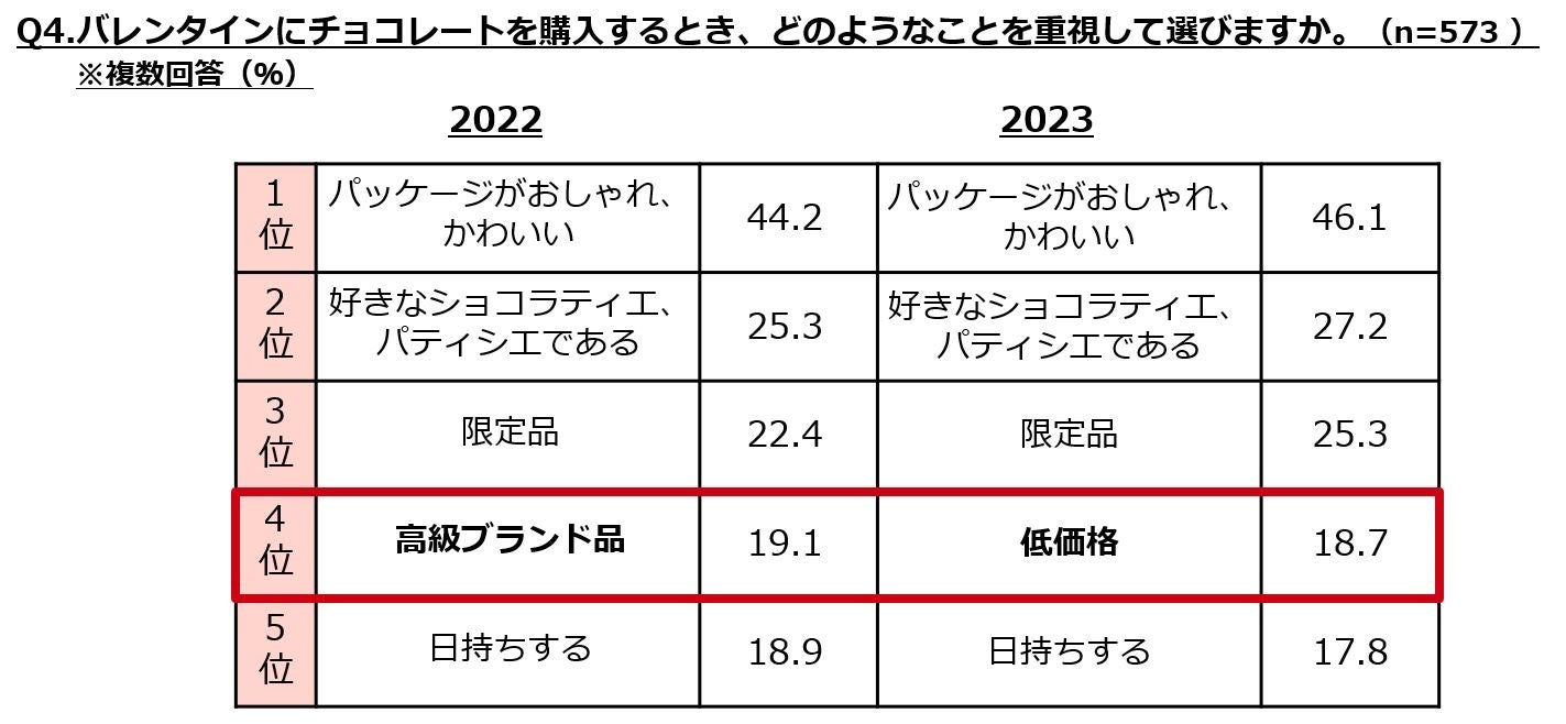 ・重視点TOP3は「パッケージがおしゃれ、かわいい」「好きなショコラティエ、パティシエ」「限定品」 で昨年と変わらず。4位は昨年の「高級ブランド」に代わり「低価格」がランクイン。