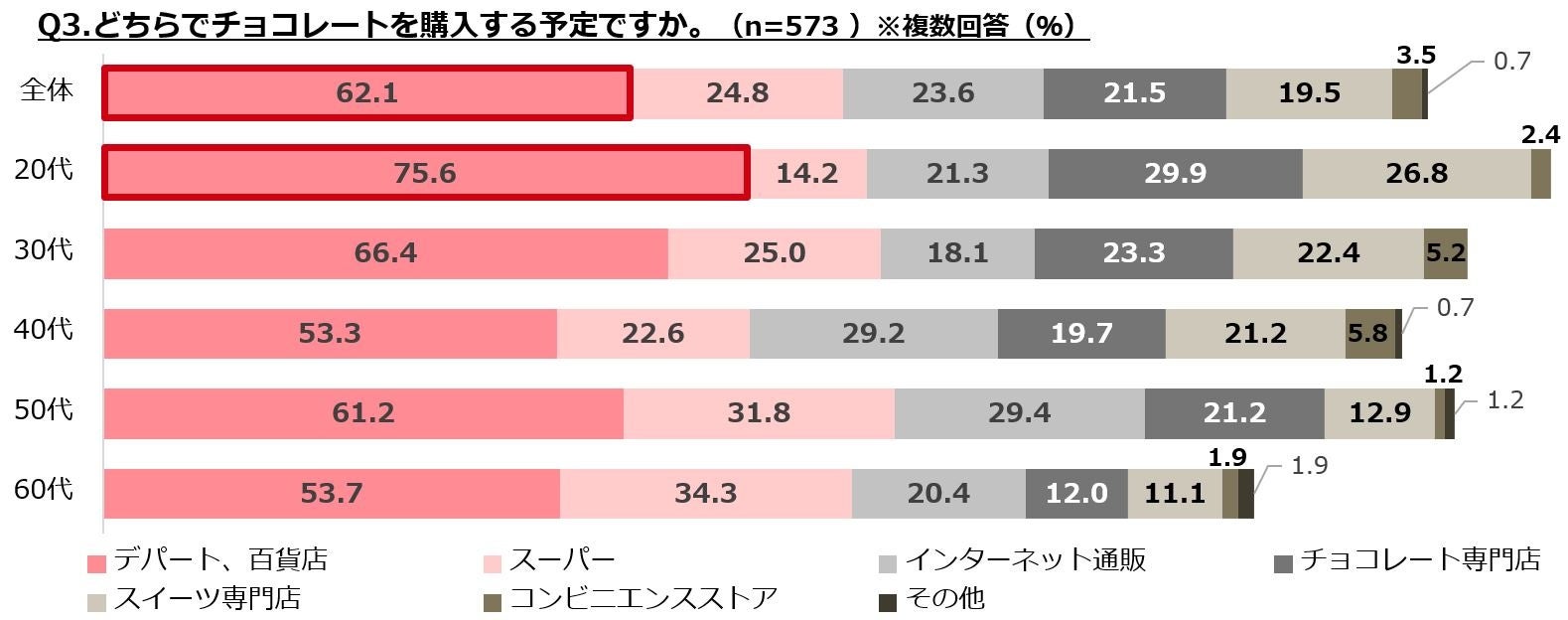 ・購入先は「デパート、百貨店」が6割で最多。年代別では20代が7割台半ばと高い傾向。