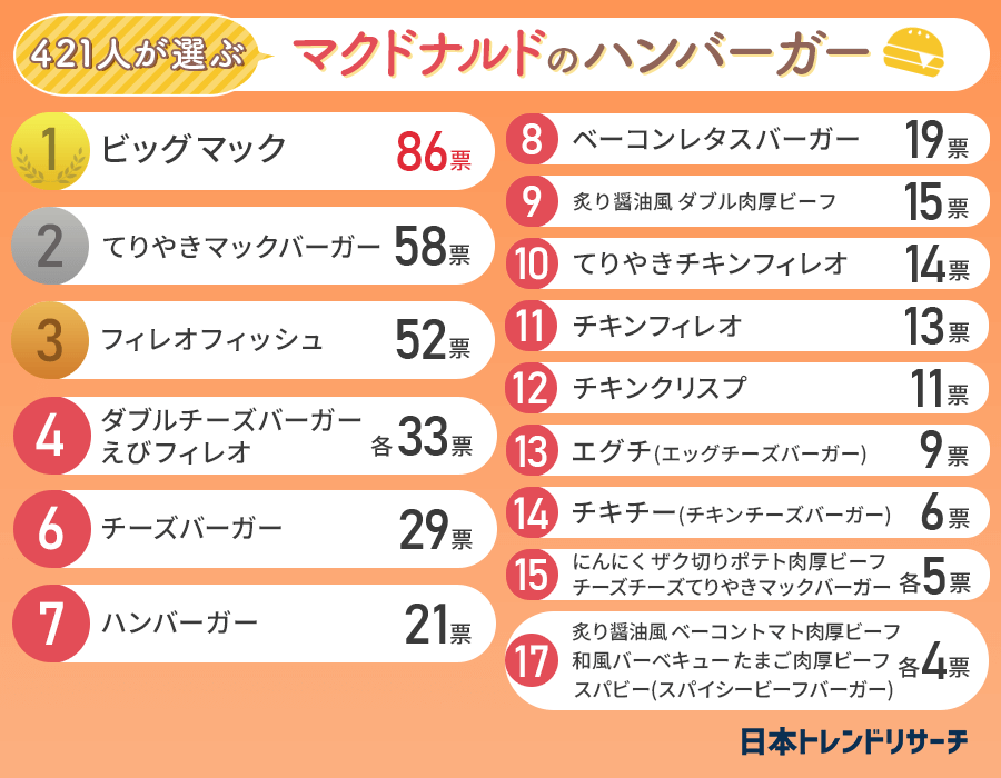 本記事では、マクドナルドのレギュラーメニューの中で人気の高いハンバーガーを調査しました。