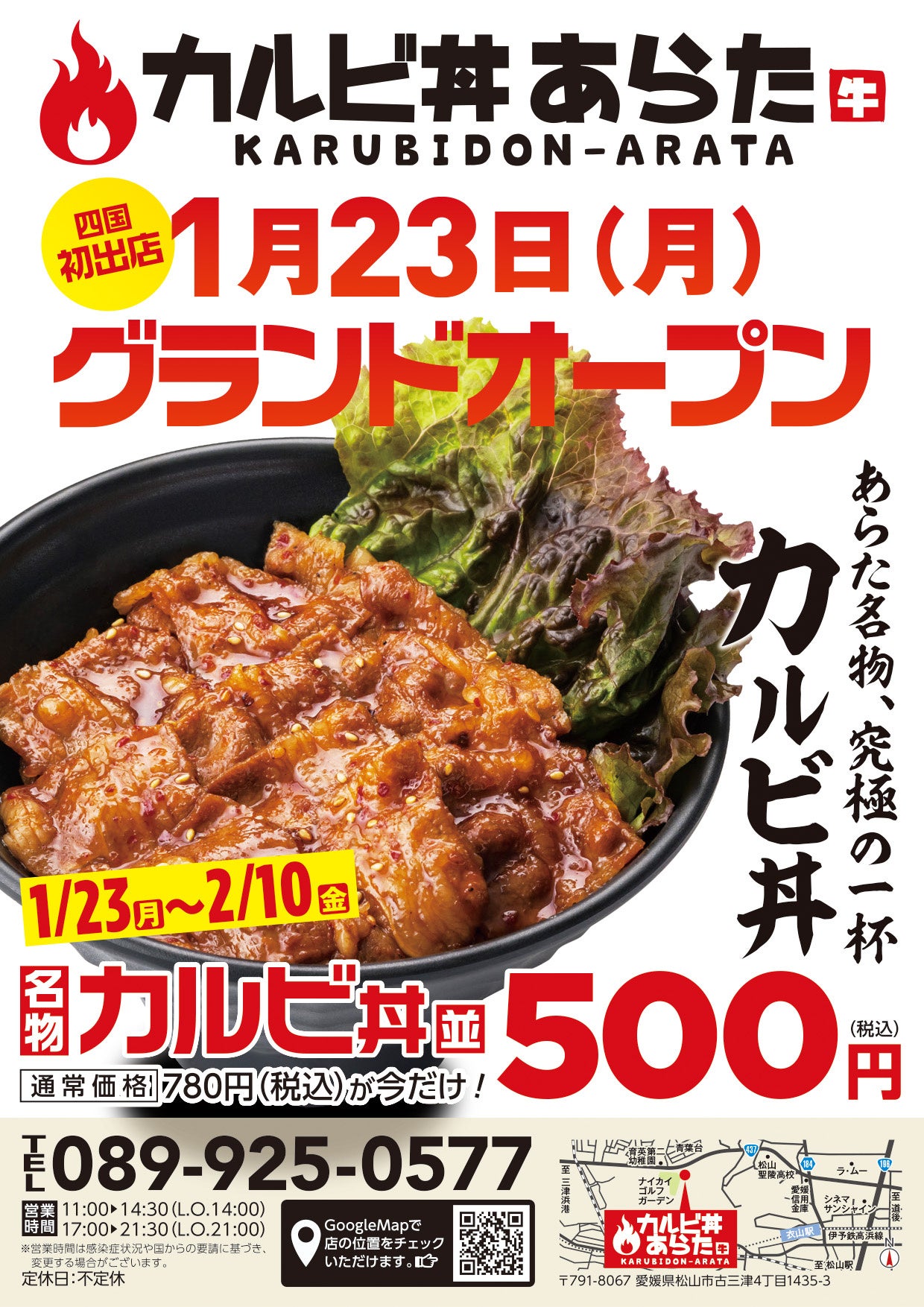 ワンズトライン株式会社(本社:大阪市北区芝田2丁目3番16号、代表取締役:山内仁)は、四国エリア初出店となる「カルビ丼あらた 久万ノ台店」(住所:愛媛県松山市古三津4丁目1435-3、TEL:089-925-0577)を、’23年1月23日(月)オープンいたします。