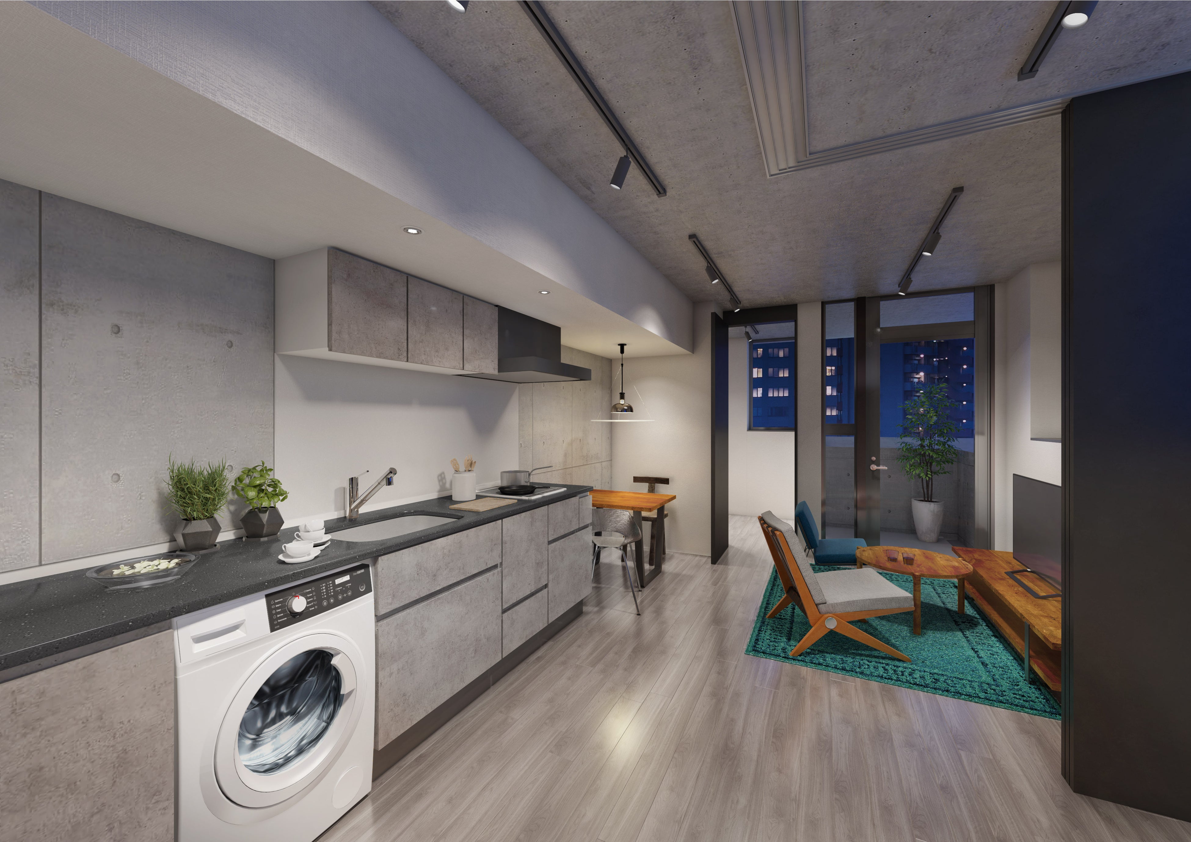 コンクリート打ち放しを基調としたデザイン性の高い住戸は、高い天井高と梁の出ない天井で開放感を実現。分譲マンション仕様のキッチンの下には、ドイツAEG社製のドラム式洗濯機を標準装備しております。
