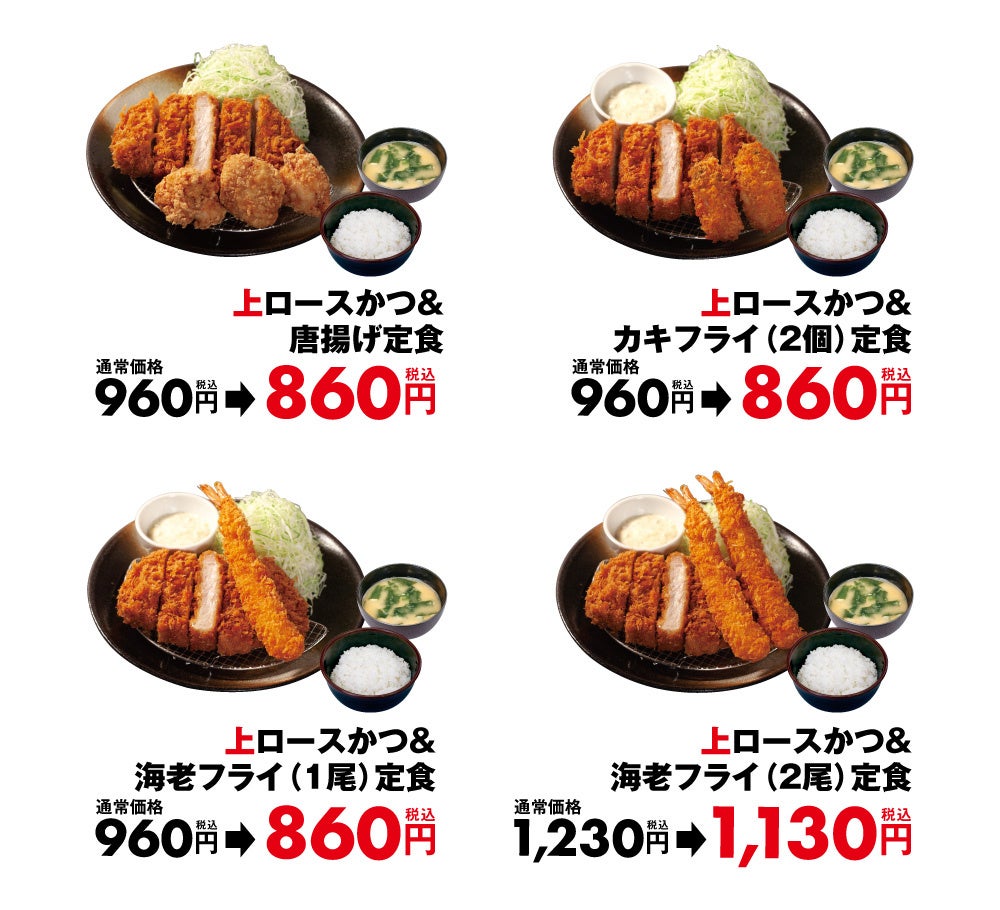 | 商品名 上ロースかつ&唐揚げ定食 960円 → 860円 上ロースかつ&カキフライ2個定食 960円 → 860円 上ロースかつ&海老フライ1尾定食 960円 → 860円 上ロースかつ&海老フライ2尾定食 1230円 → 1130円 ※全て税込価格です。また、店内・お持ち帰りの税込価格は同一です。 ※お持ち帰りいただけます。お持ち帰りのみそ汁は、別途60円でお買い求めいただけます。 開催期間 2023年1月25日(水)午後3時 ~ 2023年2月1日(水)午後3時 |