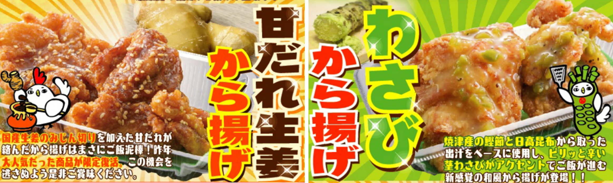 ■商品 :「甘だれ生姜から揚げ」、「わさびから揚げ」