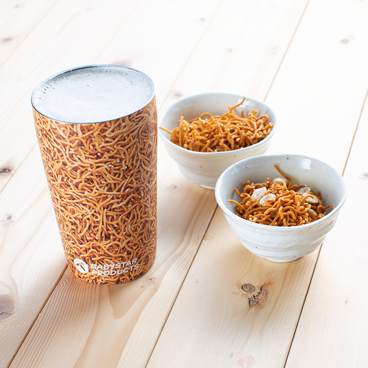 麺柄が全面にプリントされたステンレス製のタンブラーはインパクト抜群!このべビール専用タンブラーによく冷えたビールを注いで、おつまみにベビースターを用意すれば、たちまちお家での晩酌時間が至福の時間に早変わり!詳しくはおやつカンパニー公式Twitter(@BABYSTAR_OYATSU)のキャンペーンツイートをチェック!!