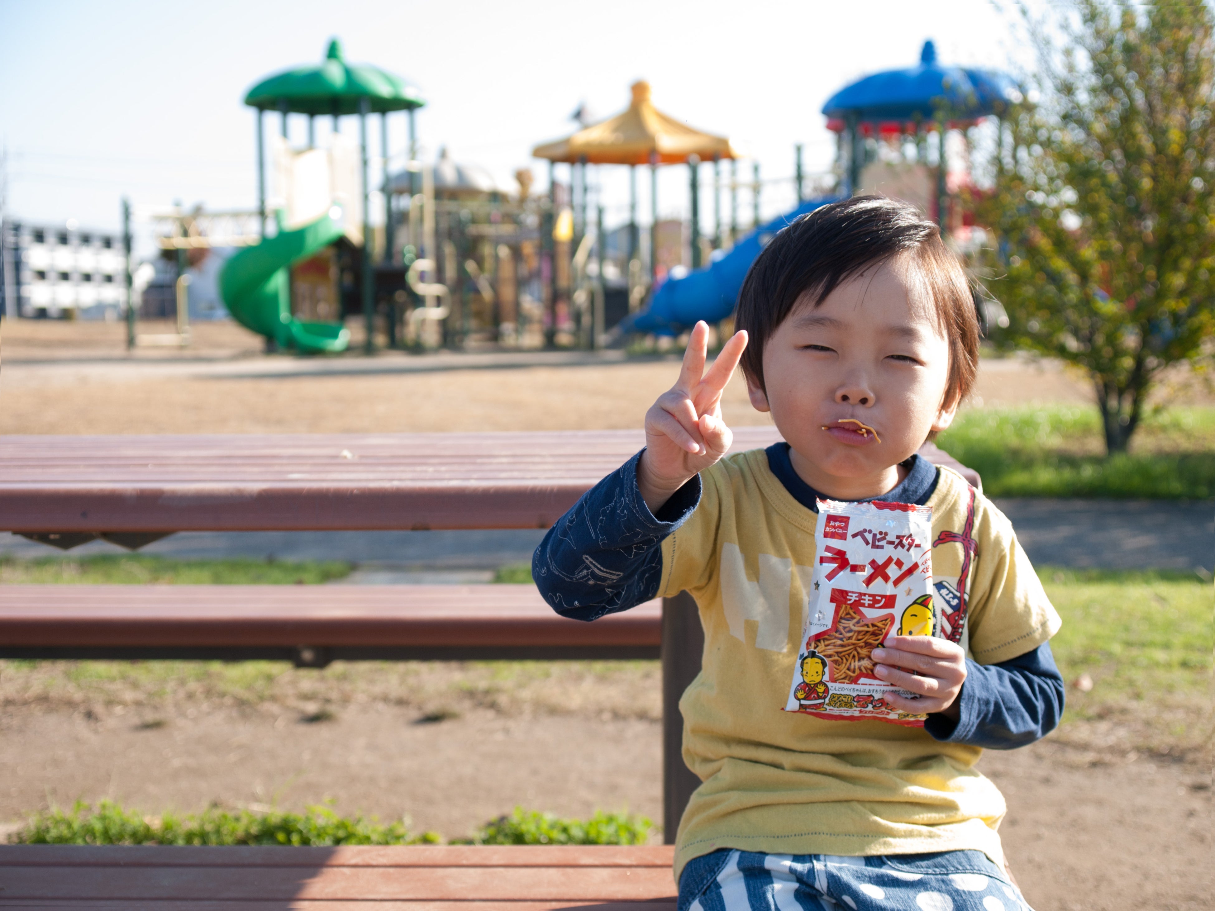 ベビースターの袋を開けて食べたら自然と顔は上向きに。大人も手づかみで食べてOK。ポロッとこぼしちゃっても、なぜか自分も周りも笑顔になっちゃうオモシロおやつ「ベビースター」。