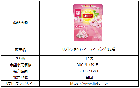 エカテラ・ジャパン・サービス株式会社(本社:神奈川県川崎市中原区、ジェネラル・マネジャー:光宗 晃子)が展開する紅茶ブランド「リプトン」は、ほんのり桜が香る季節限定の大人気フレーバーティー「リプトン さくらティー ティーバッグ 12袋」を2022年12月1日より、全国のスーパーマーケット等の量販店、一般小売店等にて販売しております。