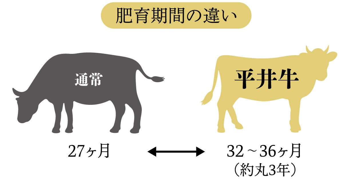 通常27か月で出荷するブランド牛が多い中「平井牛」では32-36か月と通常より半年~9か月ほど長く肥育します。