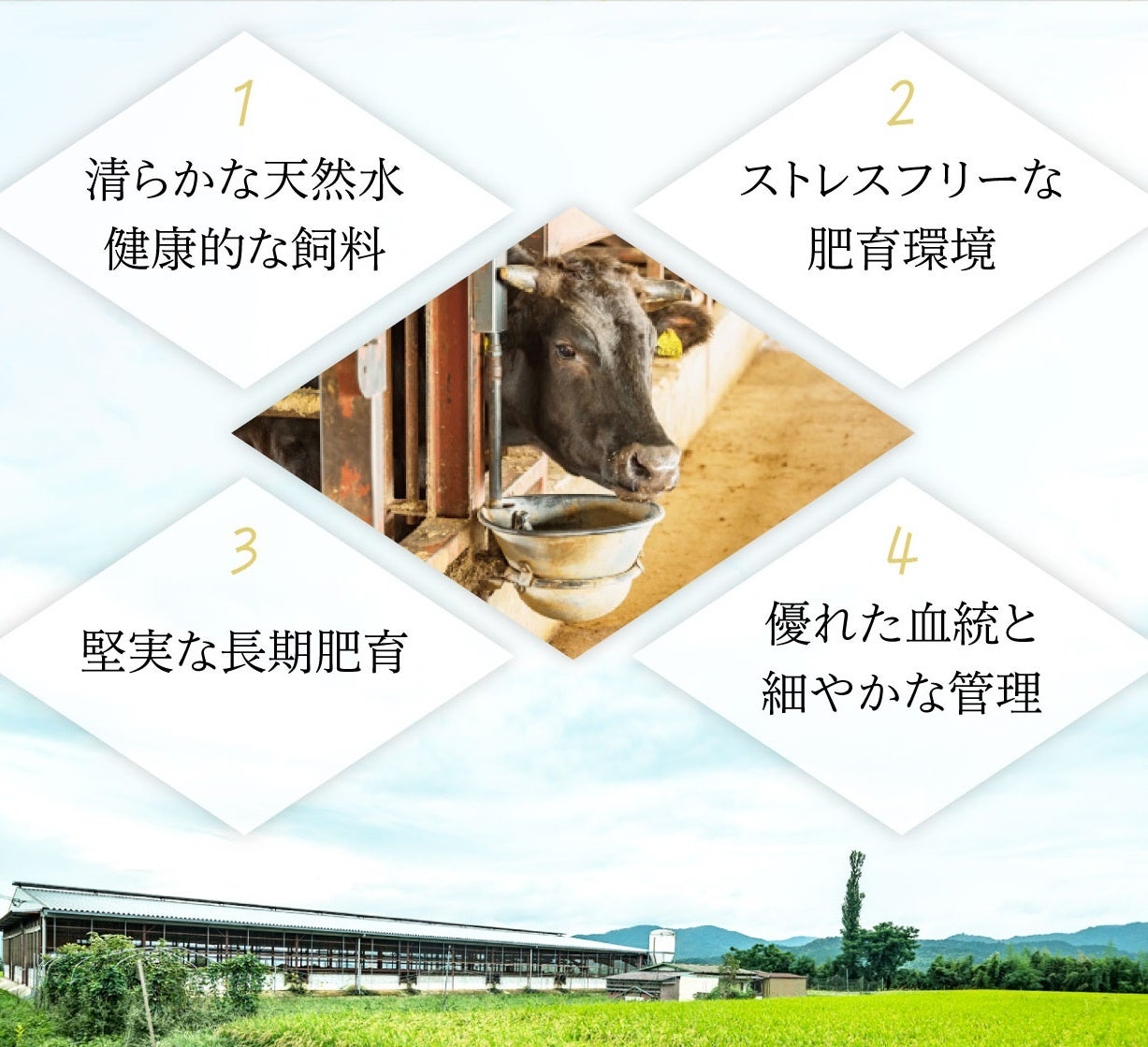 おいしい水、四季折々の豊かな自然の中で、ストレスフリーな肥育環境と長期肥育にこだわり、その繊細な味わいと上品な舌ざわりは、まさに美味の贅を極めた逸品です。