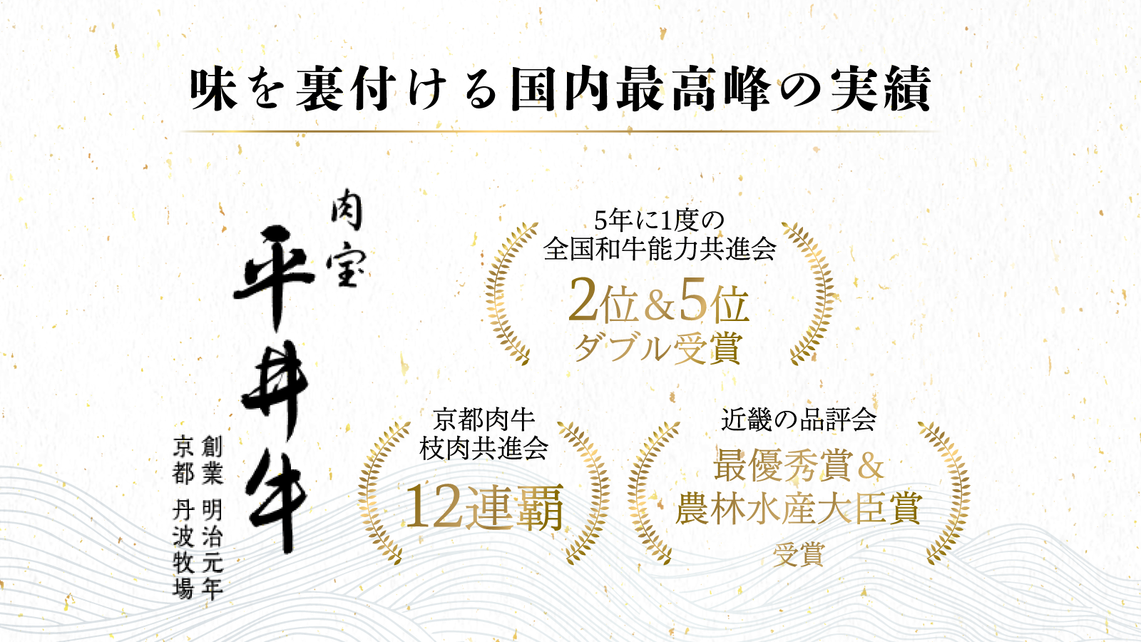 特に地元の京都では「京都肉牛枝肉共進会」という品評会で「最優秀賞」「京都府知事賞受賞 12連覇」という偉業を成し遂げ、『京都AMAN「鷹庵」』『京都リッツ・カールトン』『京都フォーシーズンホテル』と名だたる高級ホテルで採用され「食通も思わず唸る、秘密にしたいブランド牛」と言われることもあります。