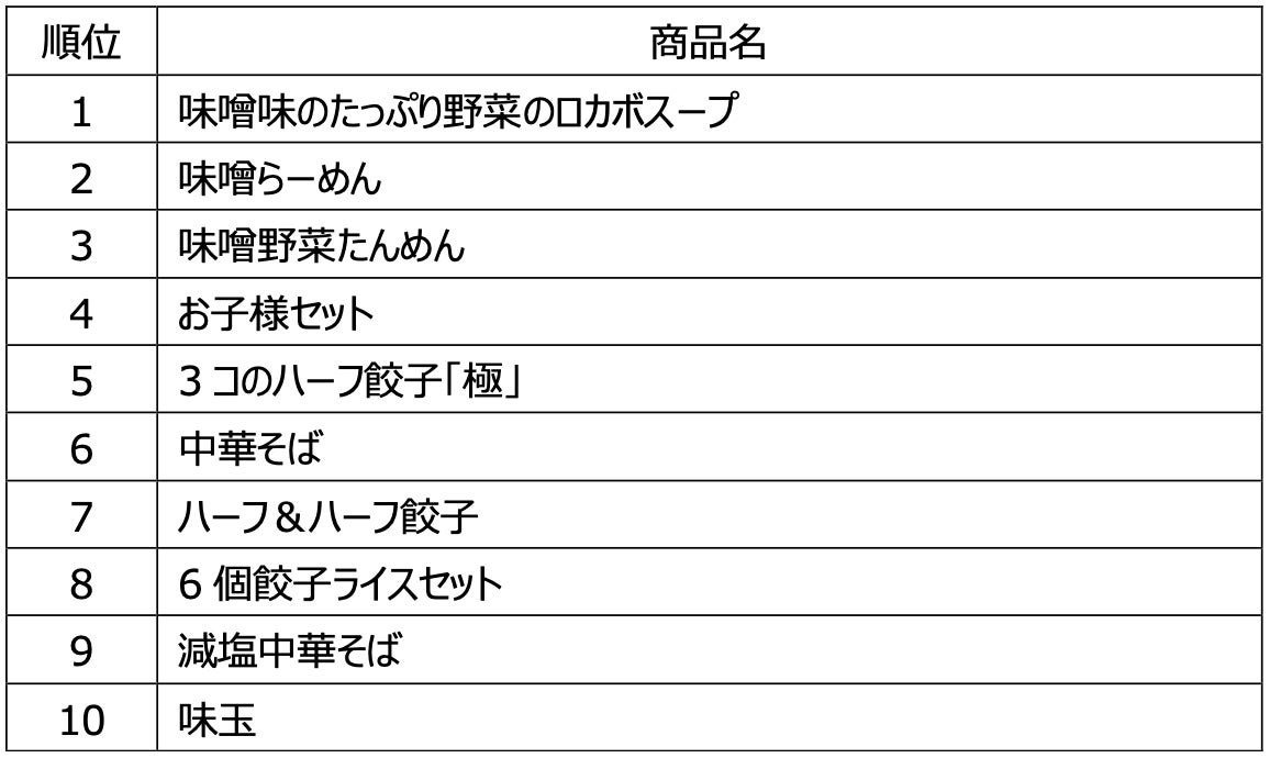 本企画では、「幸楽苑」における「楽天ポイントカード」の利用データを活用し、リピートされているメニューをランキング化しました。定番の「中華そば」を抑えて、1位に「味噌味のたっぷり野菜のロカボスープ」、9位に「減塩中華そば」と健康志向のメニューが並ぶ結果となりました。7位の「ハーフ&ハーフ餃子」は通常の餃子とベジタブル餃子が3個ずつ入っている商品で、ヘルシーに食事を楽しみたいという志向が反映された結果となりました。