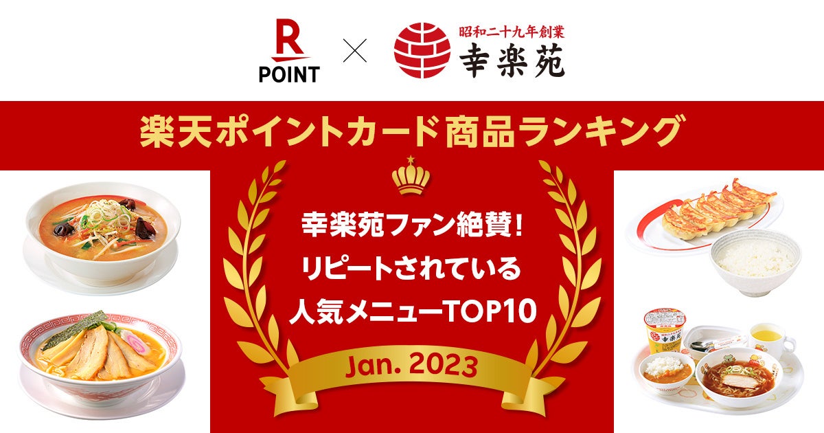株式会社幸楽苑ホールディングス(本社:福島県郡山市、代表取締役社長:新井田 昇、以下「幸楽苑」)は、楽天ペイメント株式会社(本社:東京都港区、代表取締役社長:小林 重信、以下「楽天ペイメント」)と共同で、「楽天ポイントカード商品ランキング」において「幸楽苑ファン絶賛!リピートされている人気メニューTOP10」を発表しました。