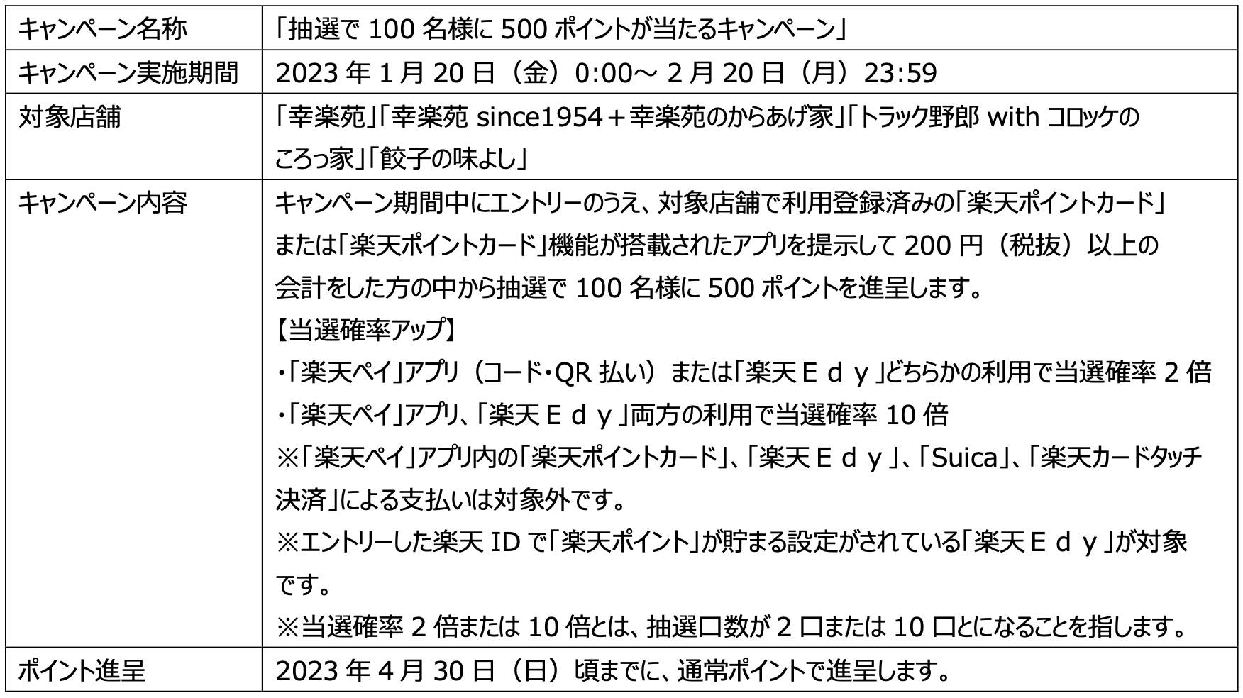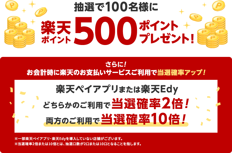 本ランキング発表にあわせて、1月20日(金)から2月20日(月)まで「抽選で100名様に500ポイントが当たるキャンペーン」を実施します。キャンペーン期間中にエントリーのうえ、対象店舗で利用登録済みの「楽天ポイントカード」または「楽天ポイントカード」機能が搭載されたアプリを提示して200円(税抜)以上の会計をしたお客様の中から抽選で100名様に「楽天ポイント」500ポイントを進呈します。さらに、「楽天ペイ」アプリ(コード・QR払い)(注1)・「楽天Edy」(注2)のどちらかで支払いをすると当選確率が2倍、両方で支払いをすると当選確率が10倍(注3)にアップします。