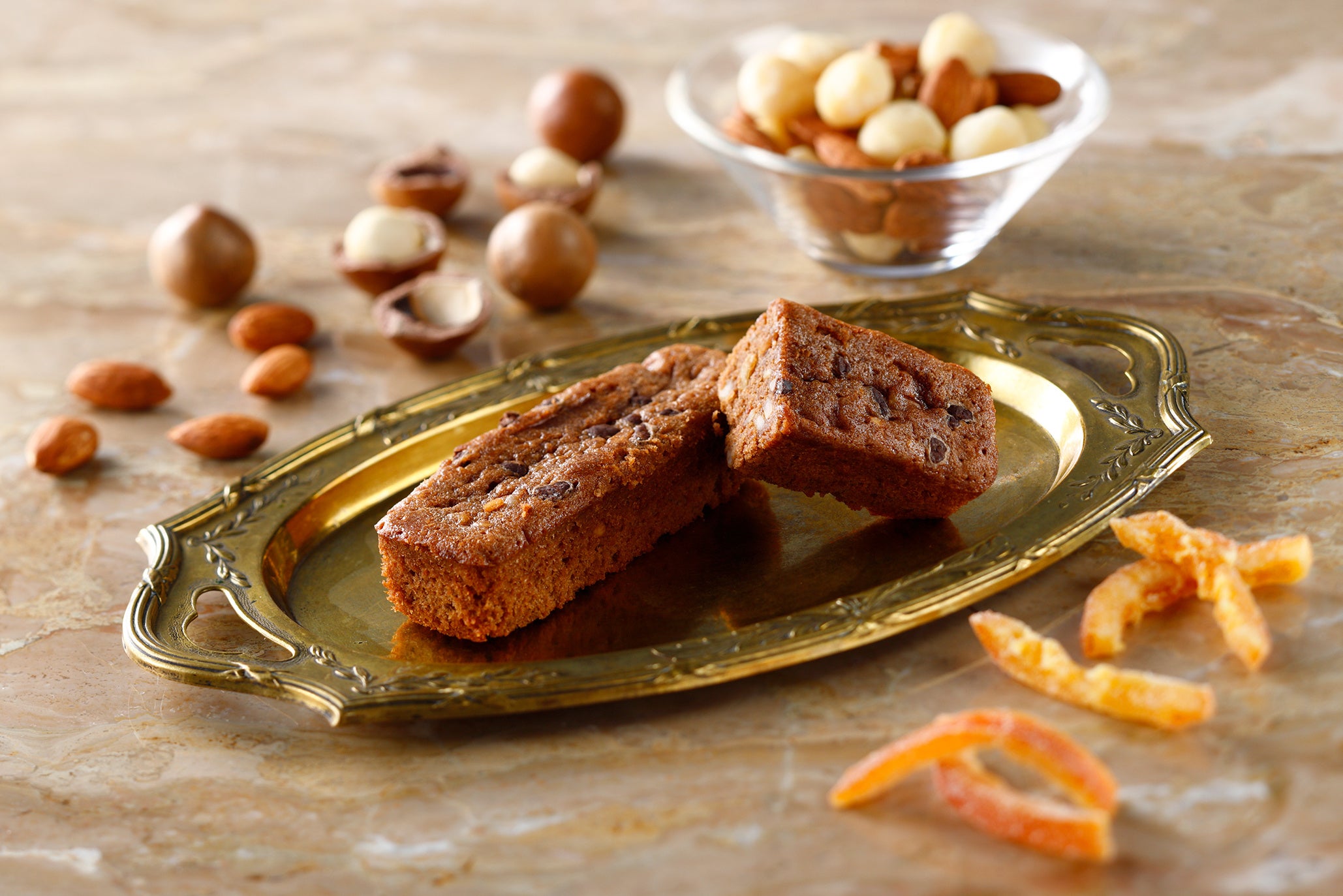 アーモンドとヘーゼルナッツのパウダーにジャンドゥーヤを加えてしっとりと焼き上げたチョコレート生地に、マカダミアとアーモンドのダイス、オレンジピールを練り込みました。