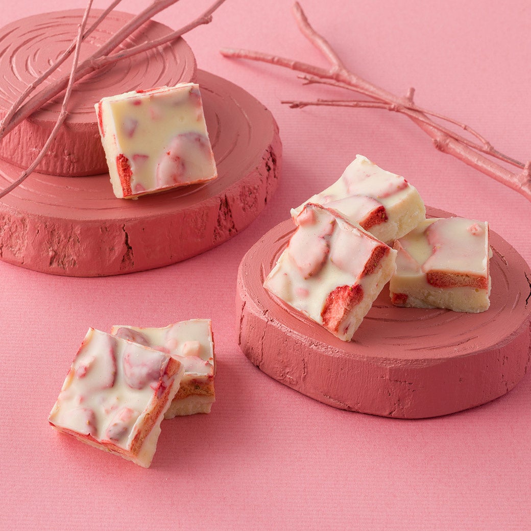 ホワイトチョコレートにフリーズドライの苺を混ぜ込みスクエア状にカット。