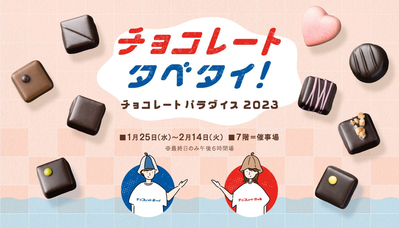 「チョコレートタベタイ!チョコレートパラダイス2023」の開催にあたり、施設・従業員の感染拡大防止策の徹底はもとより、お客さまへのマスク着用、手指消毒、ソーシャルディスタンスの確保をお願いし、体調が優れないもしくは発熱時のご来場はお控えいただくようご協力をお願いいたします。また、会場内混雑時は入場制限を設ける場合がございますのでご了承ください。