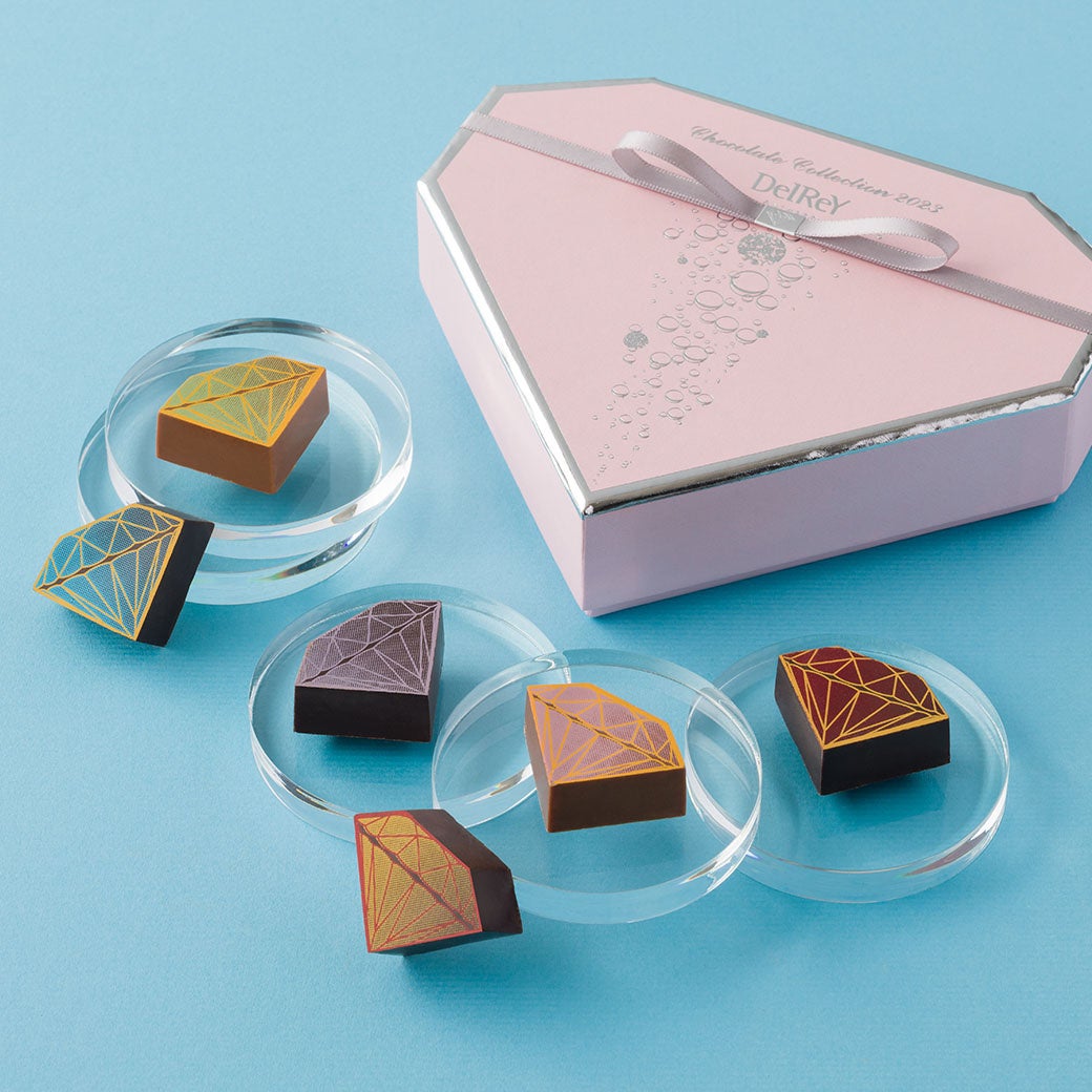 2023年限定のピンクカラーのダイヤモンドBOXにキャラメルガナッシュ入りのピンクダイヤモンドミルクやラズベリーリキュール入りのパープルダイヤモンドダークなど6種類のカラフルなショコラの詰め合わせ。