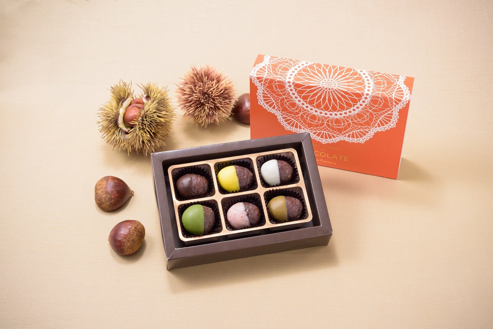 甘さを抑えた渋皮付栗甘納糖に色とりどりの6種類のチョコレートをかけました。
