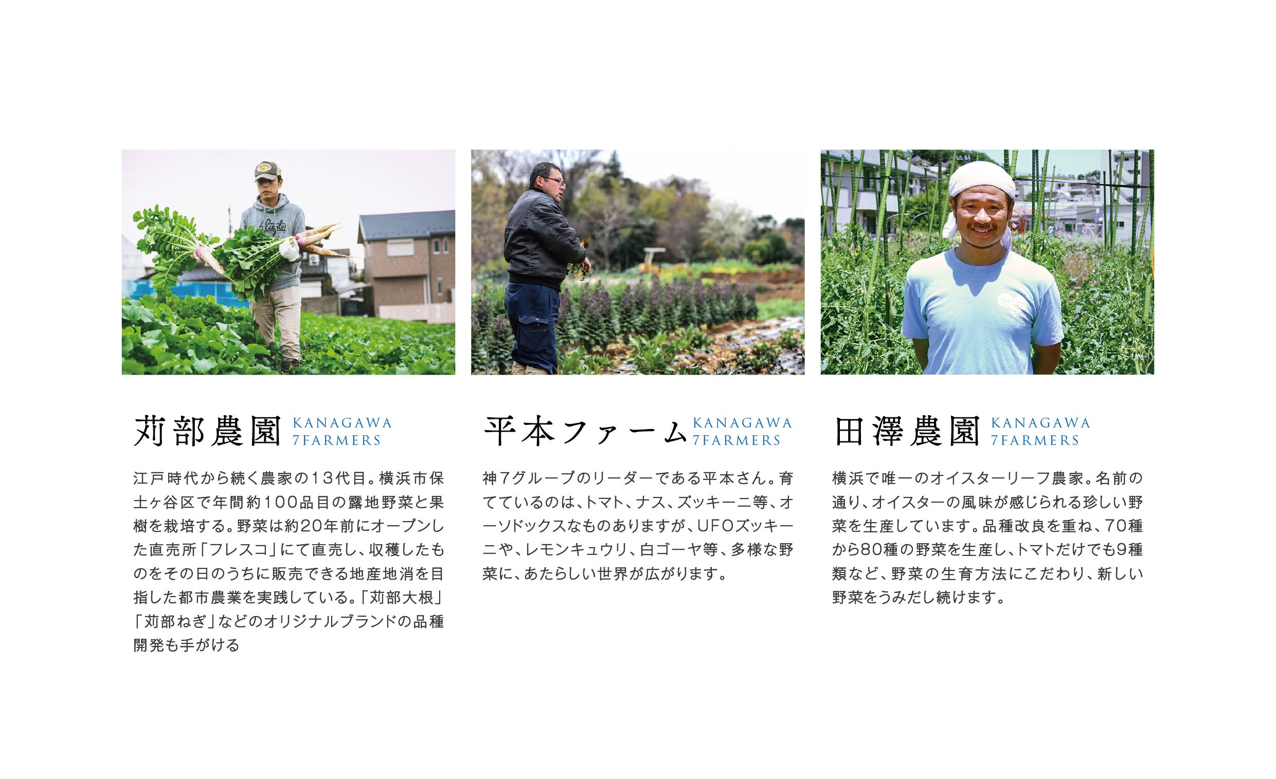 神奈川県セブンファーマーズ、通称「神7(カナセブン)」と呼ばれる、神奈川県の農家7軒からなる農家コミュニティ。市場を通した流通だけでなく、農業をやりたいと思ってもらえる魅力的な農業者の姿や生産へのこだわりを発信している。ユニオンシーフードカフェはカナセブンのコンセプトに共感し、とびきり美味しい季節野菜をお客様に提供します。
