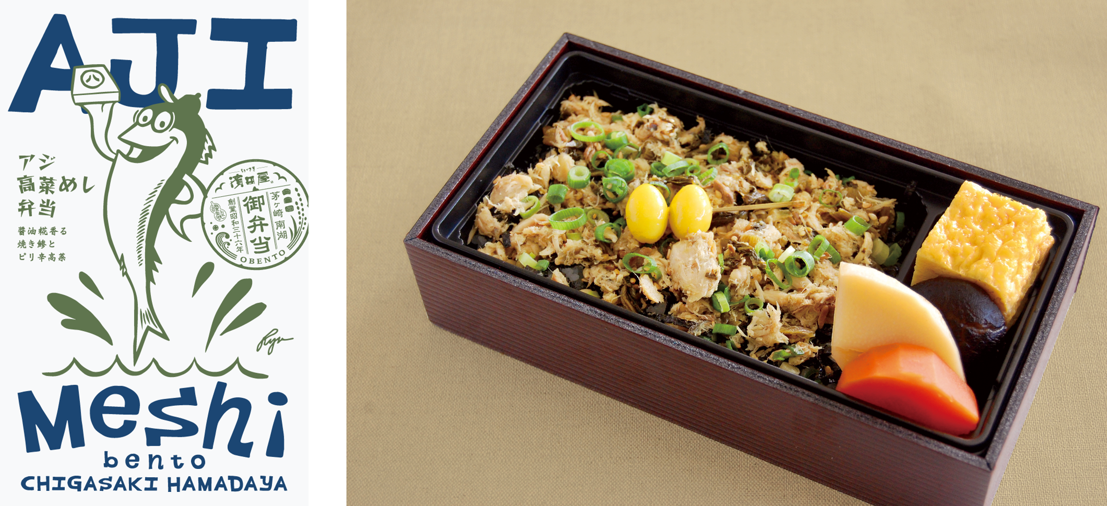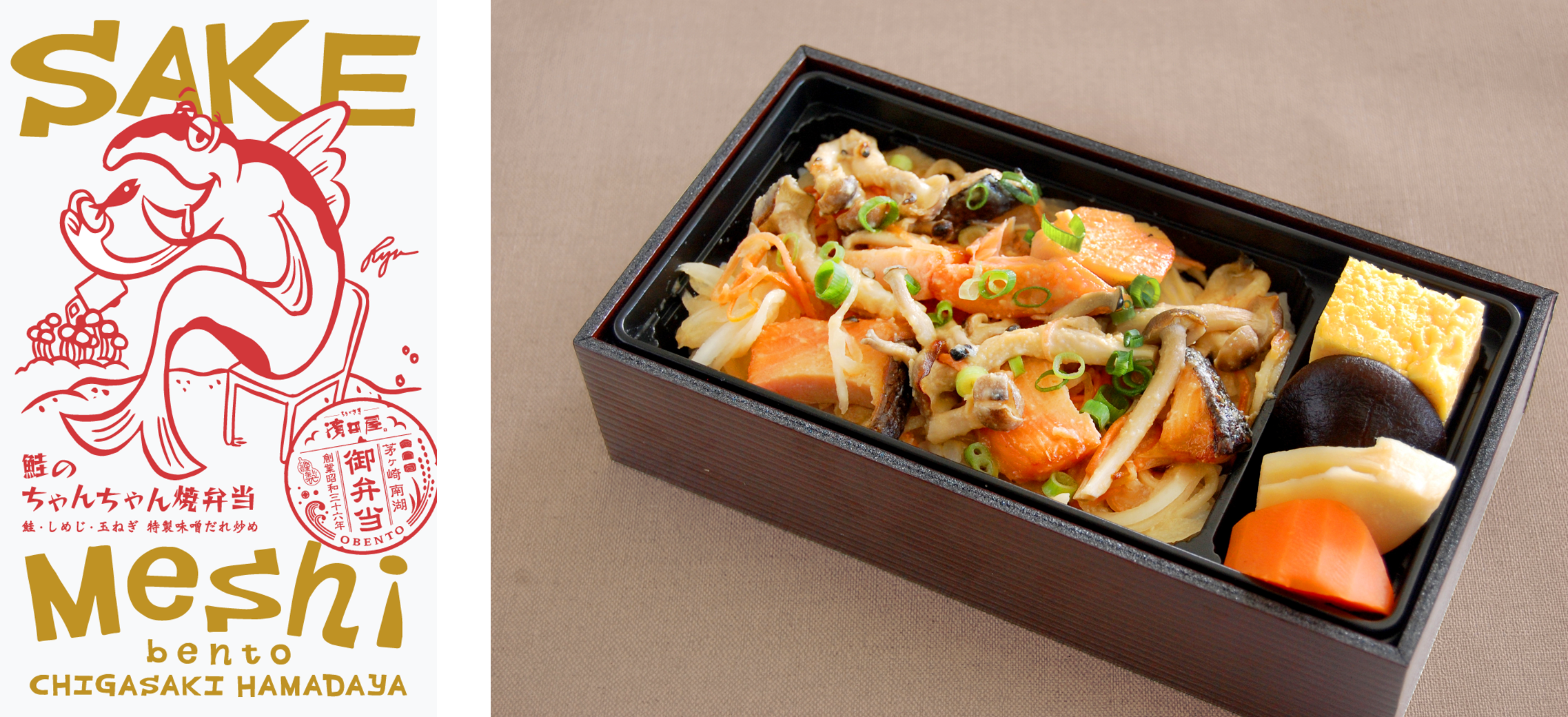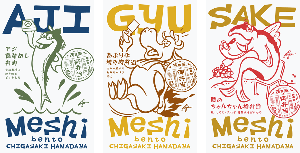 茅ケ崎の老舗企業である濱田屋と、茅ケ崎育ちのファインアーティストRyu Ambe氏が“町を元気にしよう!”という共通の思いからタッグを組み始まった企画がついに3種の弁当となって実現しました。今回のために描き下ろしていただいたオリジナルイラストは、牛のお尻に火がついていたり、鮭が魚を食べようとしていたりとポップでキュート、どこかシニカルな描写となっており、細部までこだわりが詰まっています。創業60年を超える老舗仕出し料理屋の全く新しいスタイルのお弁当を若い世代の方々にも是非味わっていただきたいとお求めやすい価格でご提供。3種とも全く新しく開発した、後を引く本格的な味付けでさまざまなシーンで幅広い層にお楽しみいただけるラインナップです。