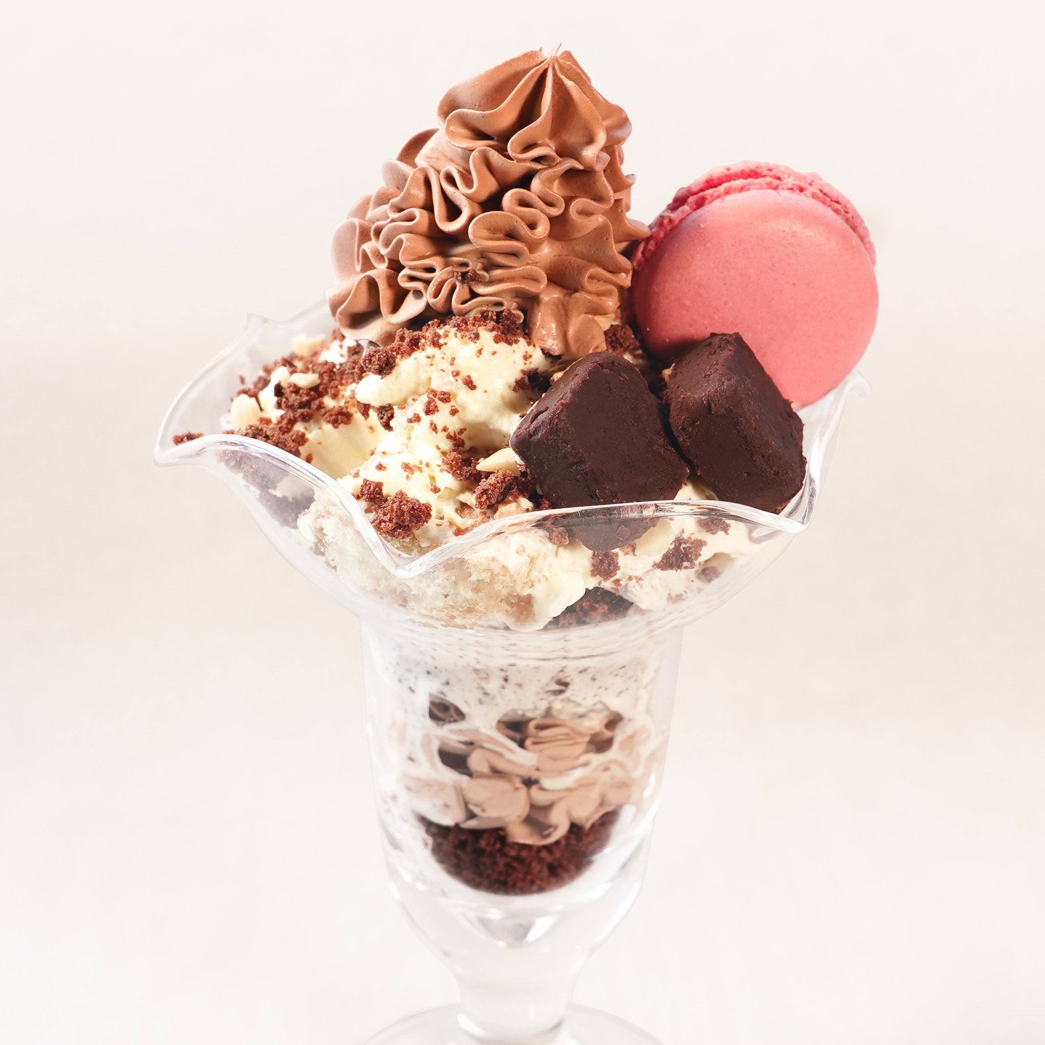 たっぷりのティラミスにハーゲンダッツアイスクリームの「クッキー&クリーム」を合わせ、生チョコとマカロンを組み合わせたゴージャスなご褒美パフェです。