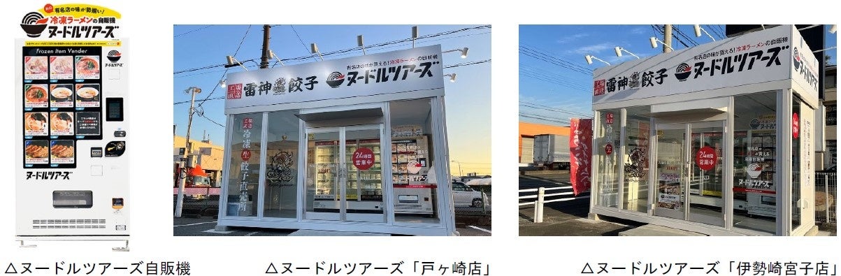 本提携により、有名ラーメンの“本物のスープ”と丸山製麺の“麺”を使用してコラボした商品が、24時間いつでも購入できる冷凍ラーメン自販機『ヌードルツアーズ』( https://noodle-tours.com/ )を、埼玉県三郷市(ダイナム戸ヶ崎店)と群馬県伊勢崎市(ダイナム群馬伊勢崎宮子店ゆったり館)の2店舗に設置し、テスト販売を開始しました。なお、本取組みは『ヌードルツアーズ』と『雷神餃子』の合同出店です。