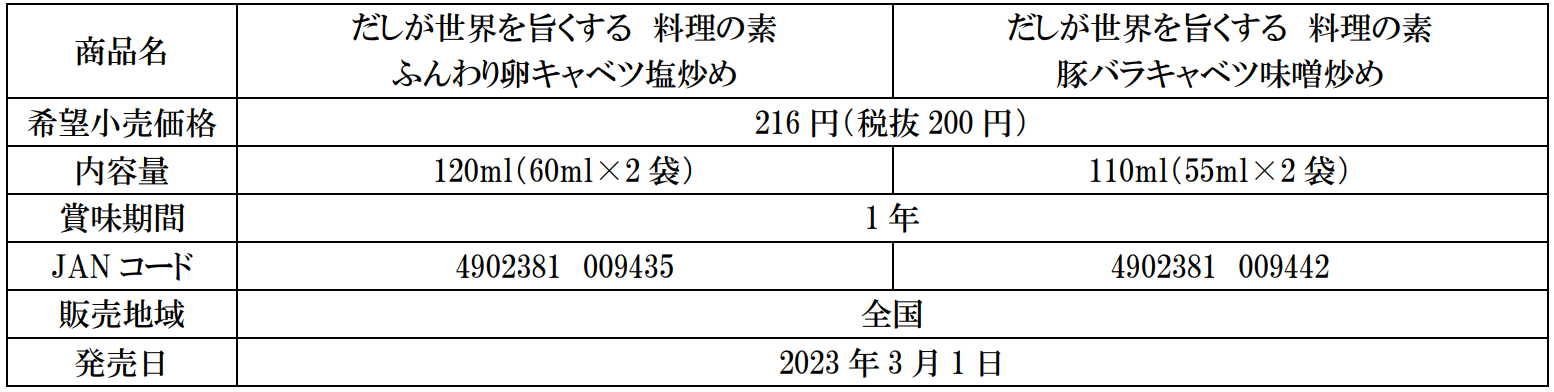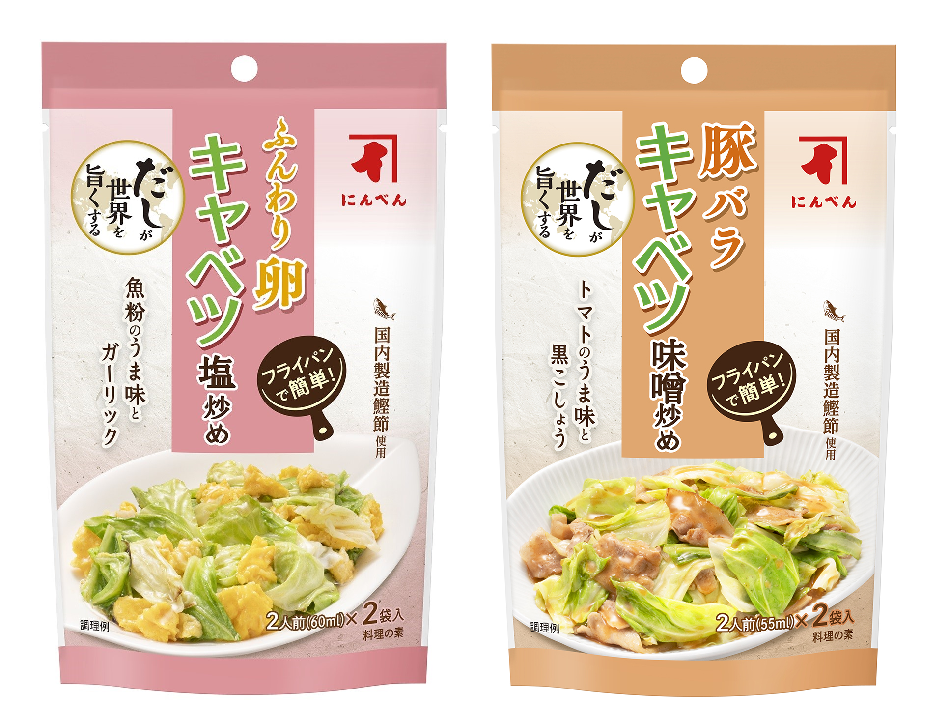 株式会社にんべん(東京都中央区、代表取締役社長 髙津伊兵衛)は、「だしが世界を旨くする 料理の素」シリーズから「ふんわり卵キャベツ塩炒め」「豚バラキャベツ味噌炒め」を、2023年3月1日(水)より全国で新発売いたします。