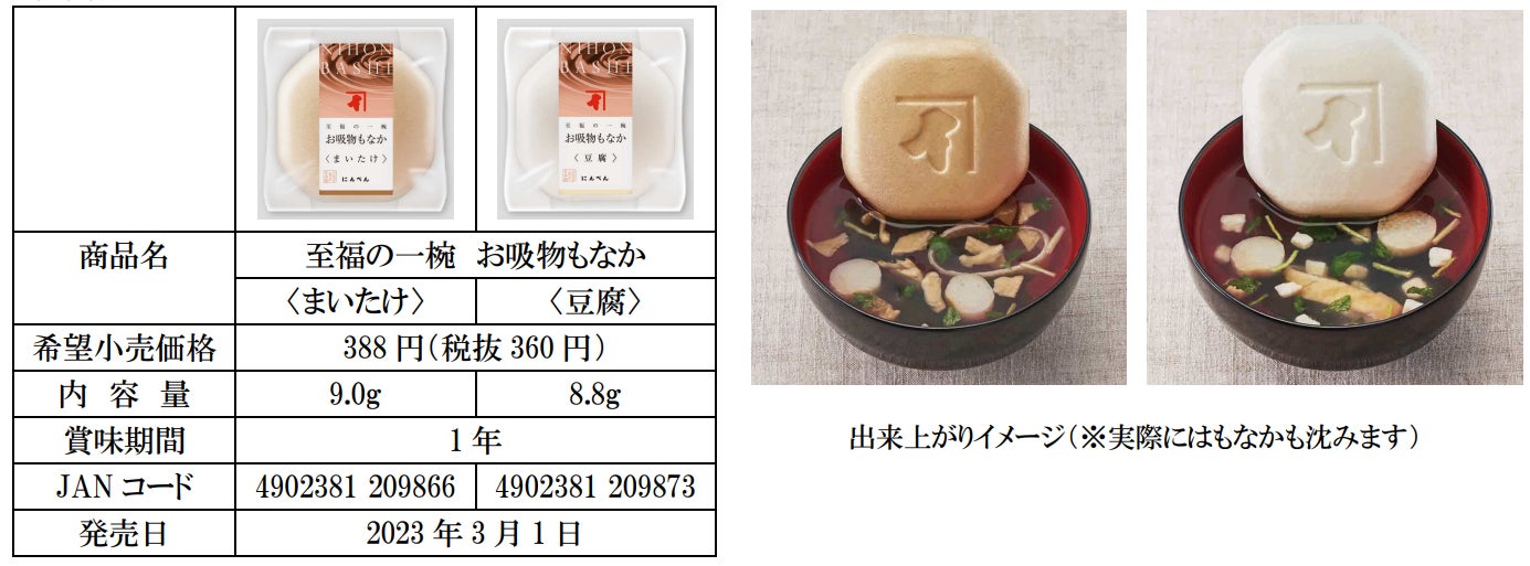 株式会社にんべん(東京都中央区、代表取締役社長 髙津伊兵衛)は、「至福の一椀 お吸物もなか」より、〈まいたけ〉、〈豆腐〉、詰合せ(5個入り)を2023年3月1日(水)より新発売いたします。